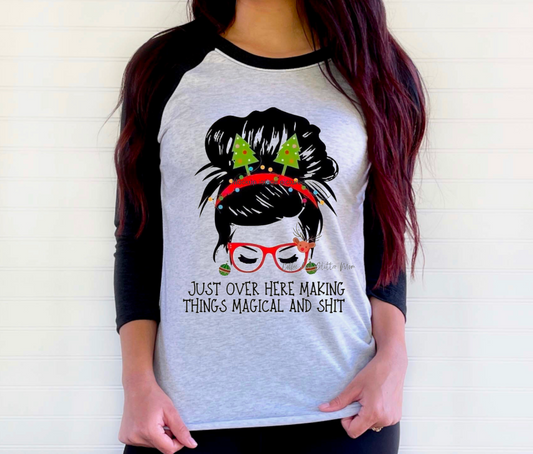 Over Here Making Shit Magical Christmas Unisex Tri-Blend Three-Quarter Sleeve Raglan Tee