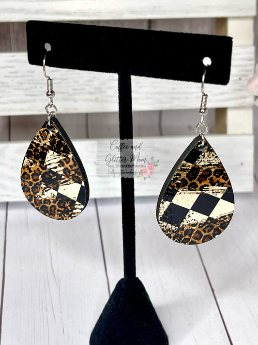 Checkered Flag Animal Print Teardrop Earrings RTS