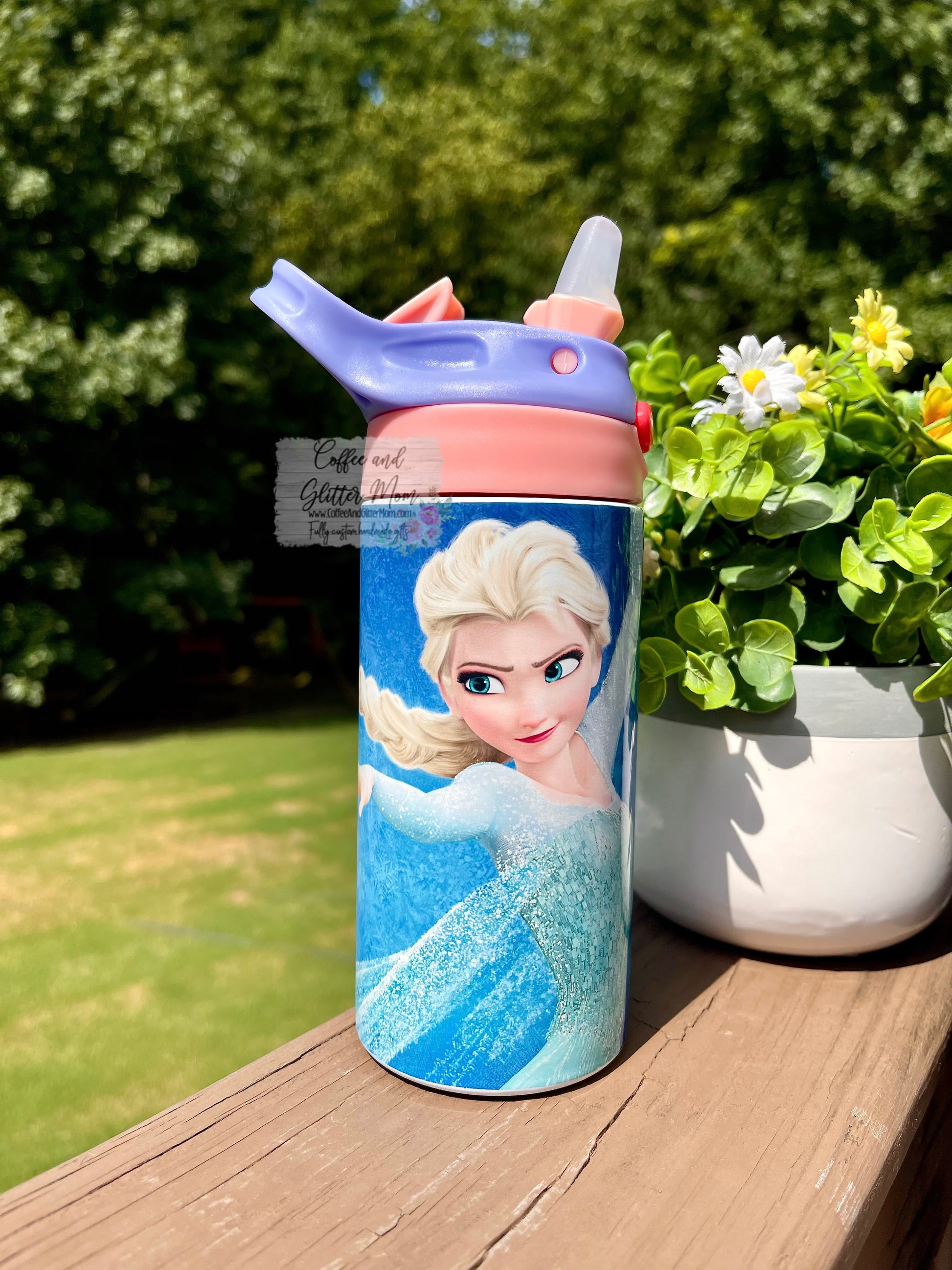 Custom-made with a high quality image, please include the name for the tumbler, what number font, and what design you'd like in the text box before adding to your cart. This tumbler will have the pictured pink and purple flip straw top.