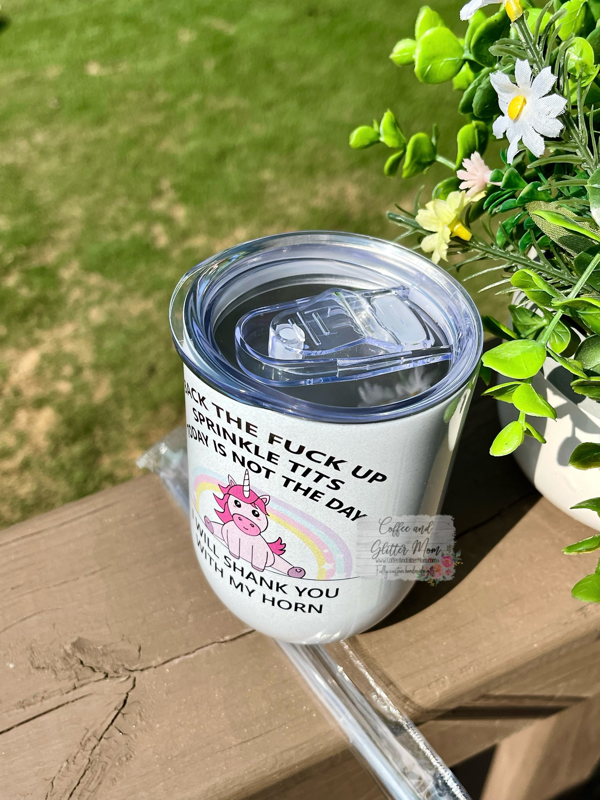 Let your tumbler do the talking! These 12oz wine tumblers come with a slide-closed lid and a straw. Keeps drinks hot or cold for up to 6 hours. This pops in a classy and fun way with a white holographic smooth glitter coating. The image is pressed into the tumbler, so no vinyl decals that can peel or come off! A reusable straw is included! *Made to order, not a ready to ship item. Approximate turn around time is 3-5 business days.