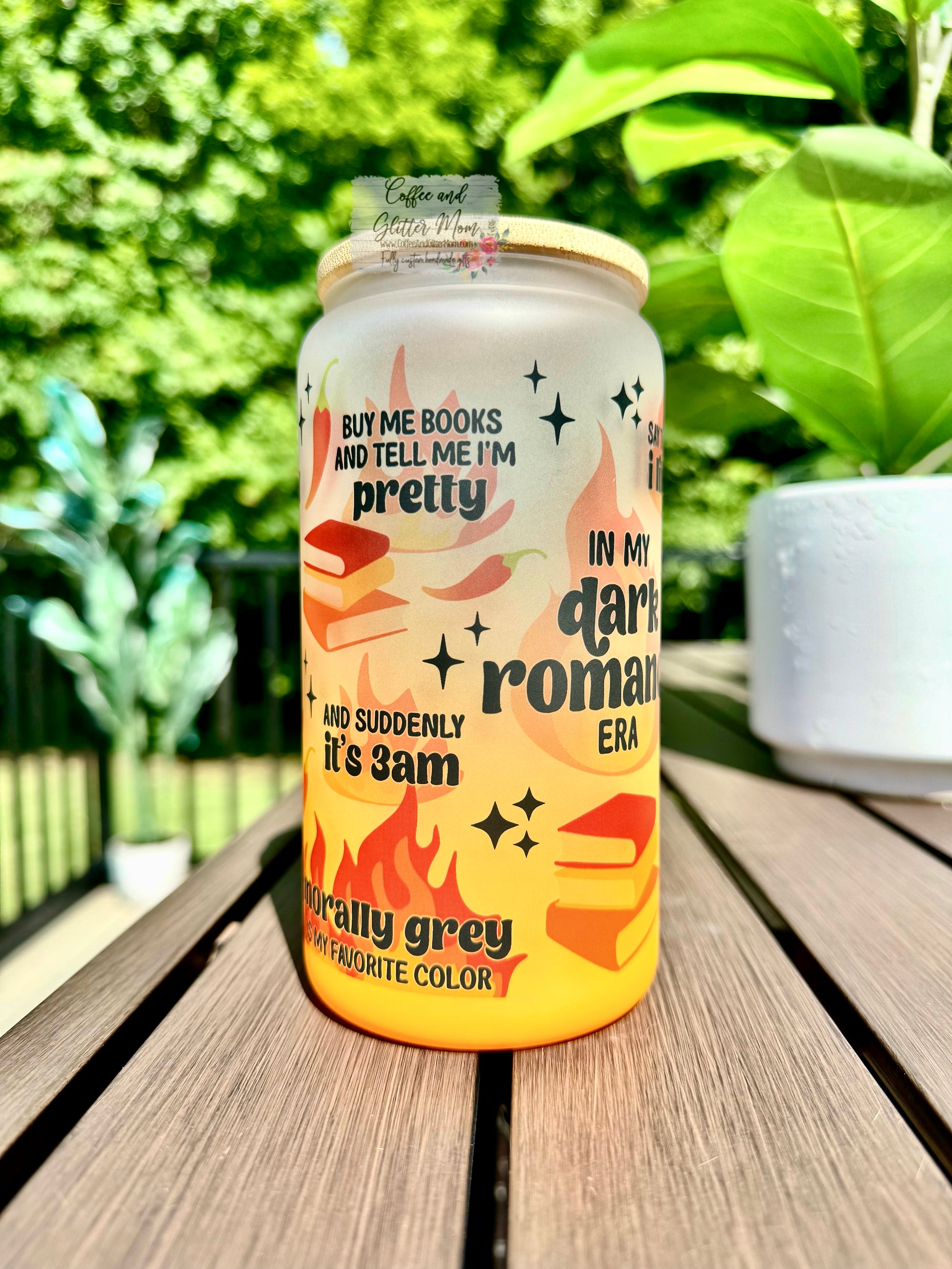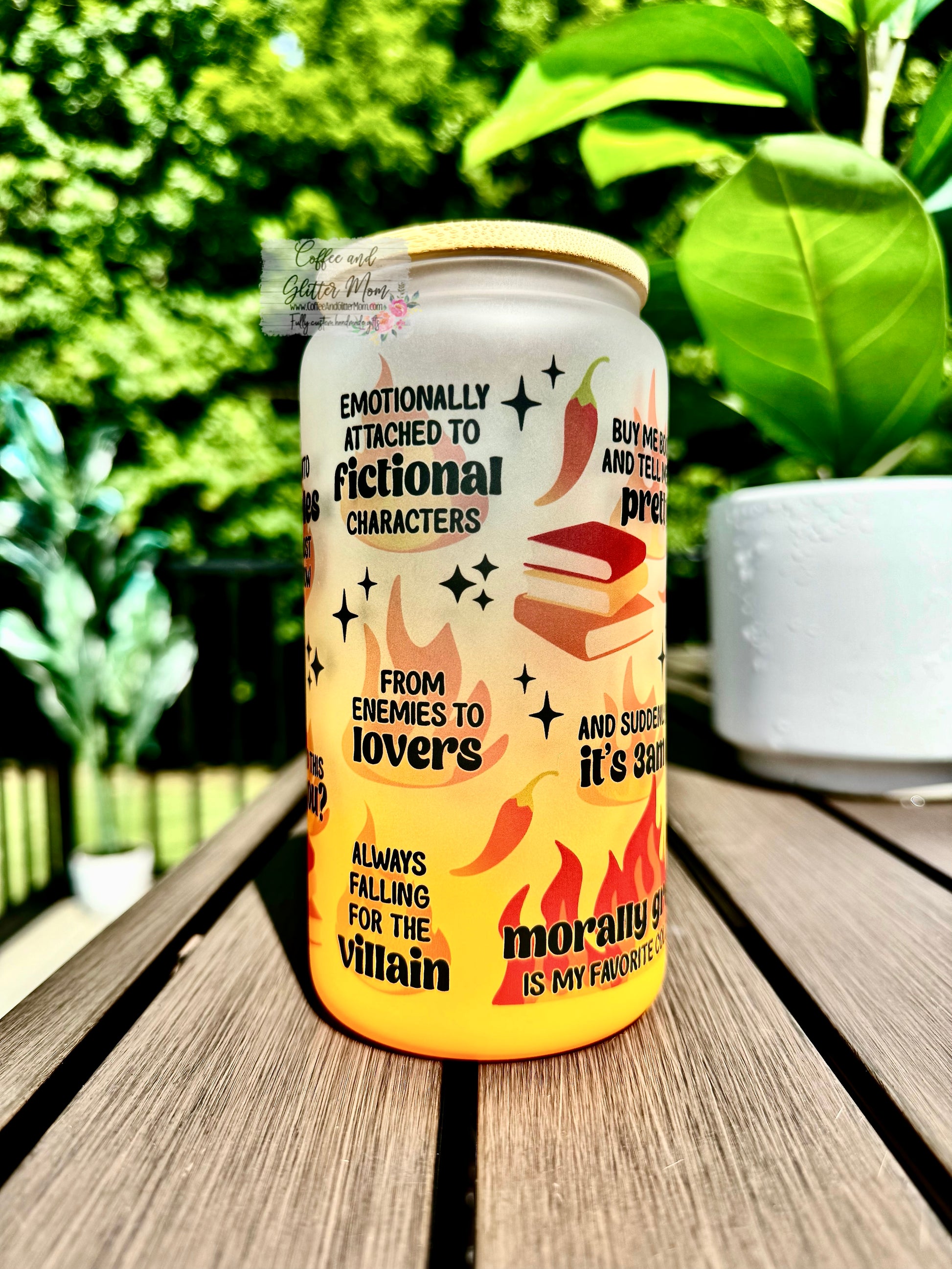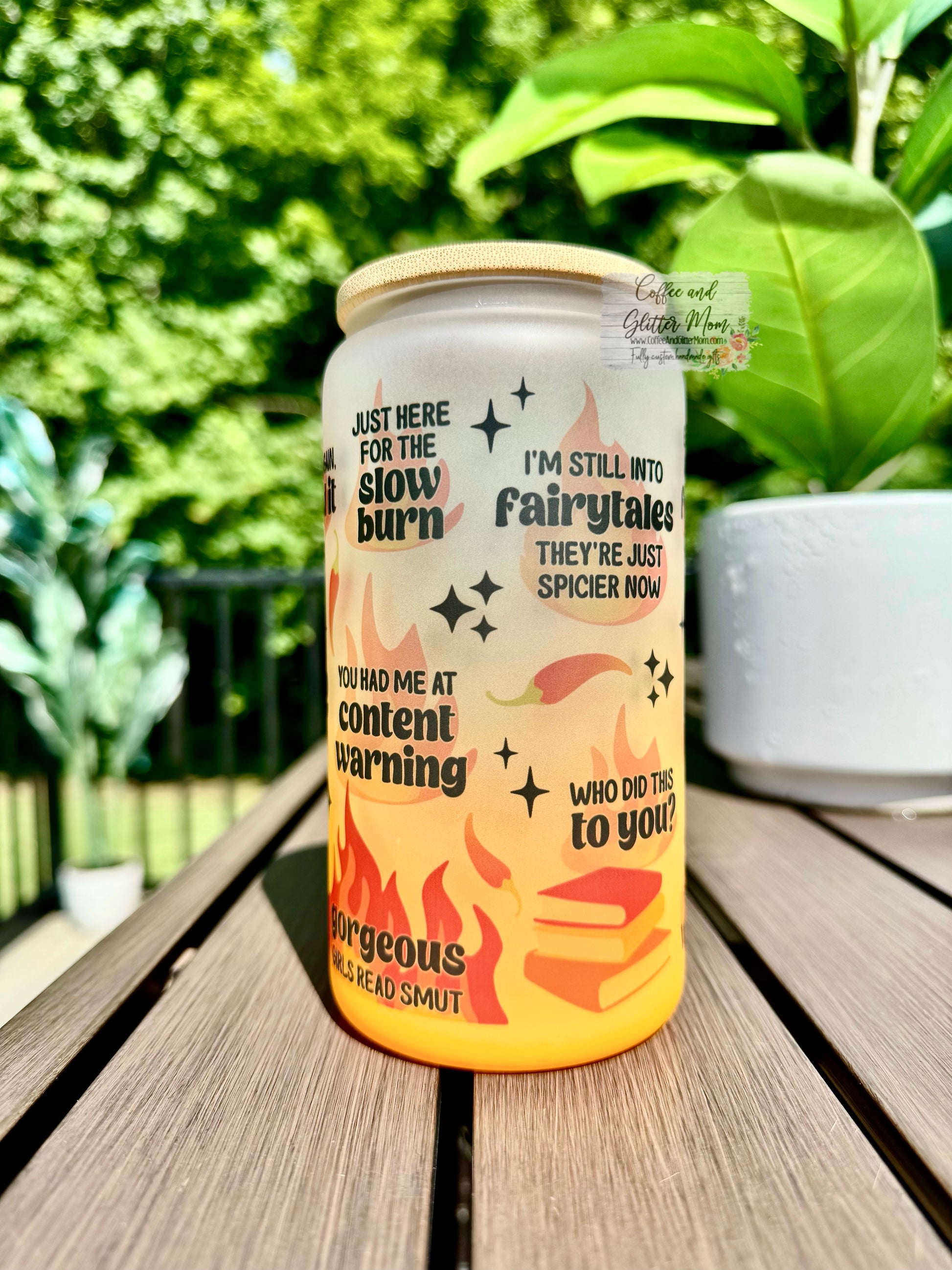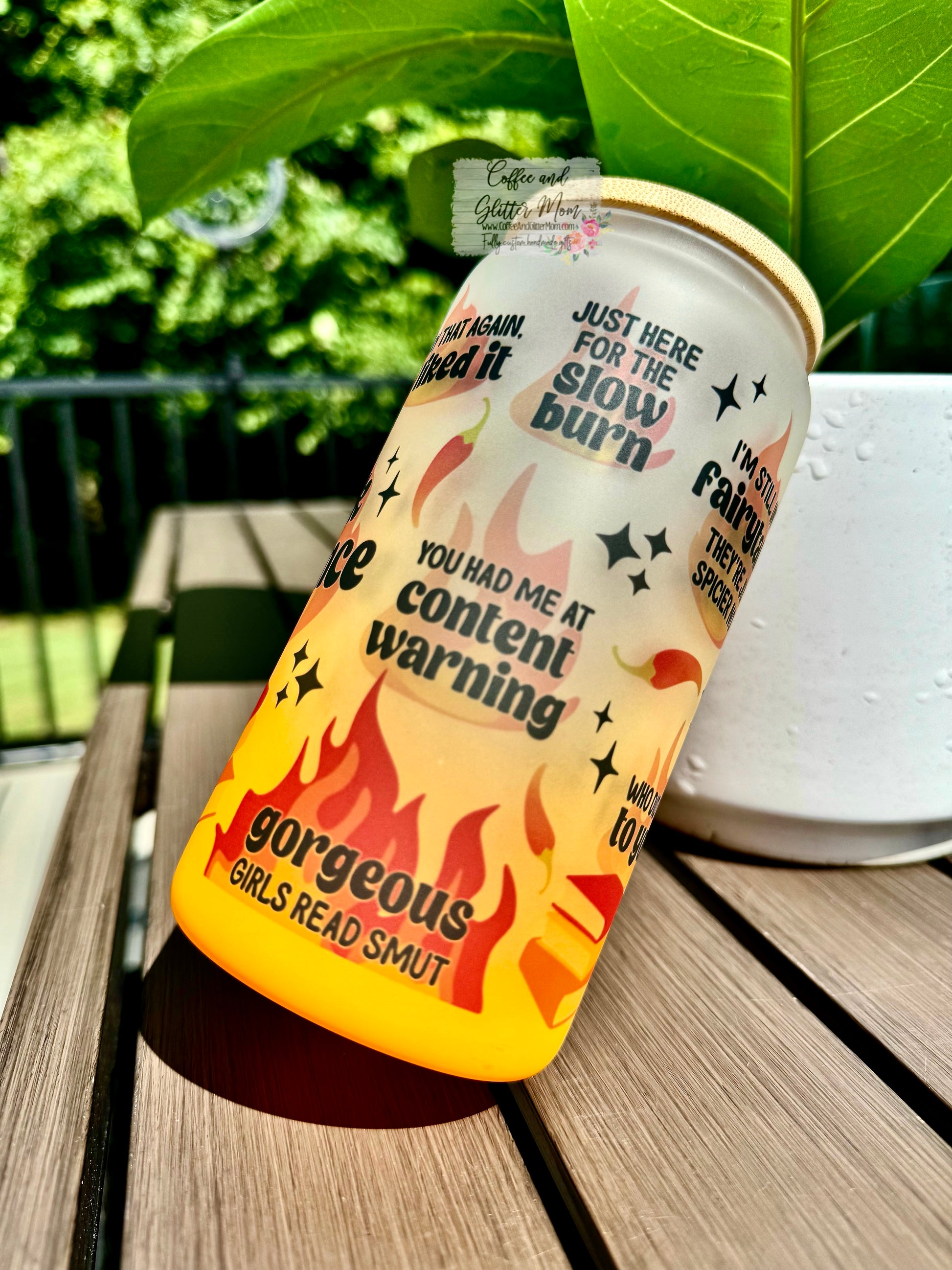 These glass cans come with bamboo lids and straws included. They stand about 6 inches tall and is about 10 inches around for the 16oz size. This glass can with lid makes the perfect gift for you and your loved one. As this is a glass can, you can see the image from the inside as well as the outside!