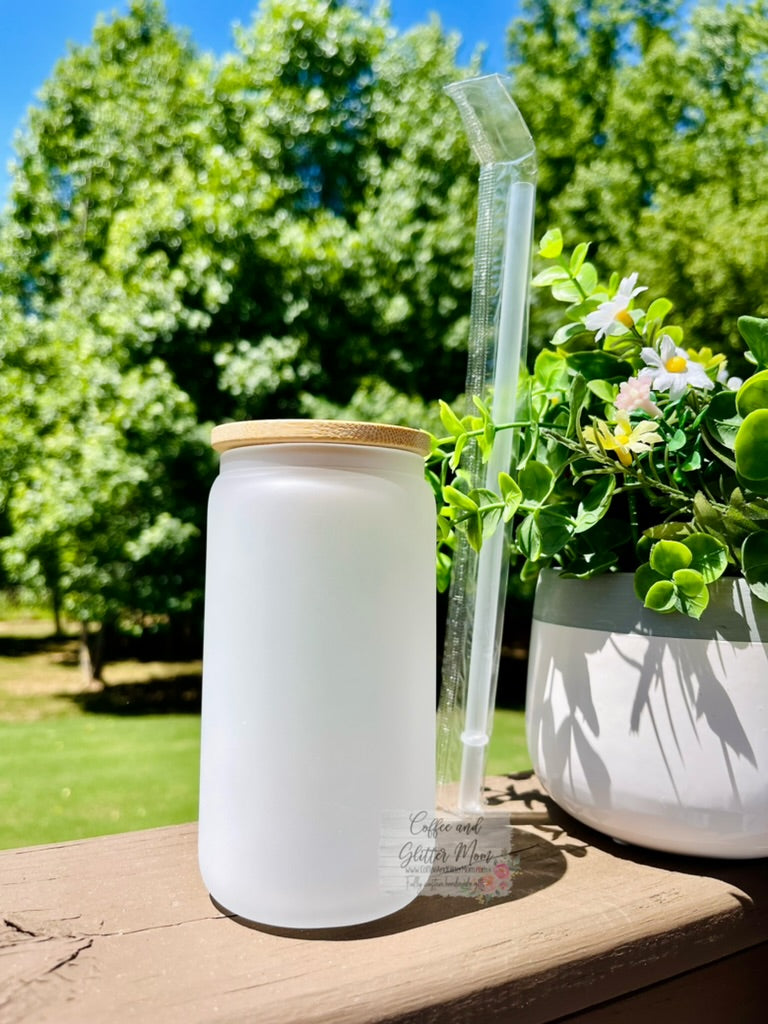 These glass cans come with bamboo lids and straws included. They stand about 6 inches tall and is about 10 inches around for the 16oz size. This glass can with lid makes the perfect gift for you and your loved one. As this is a frosted glass can, you can see the image from the inside as well as the outside!
