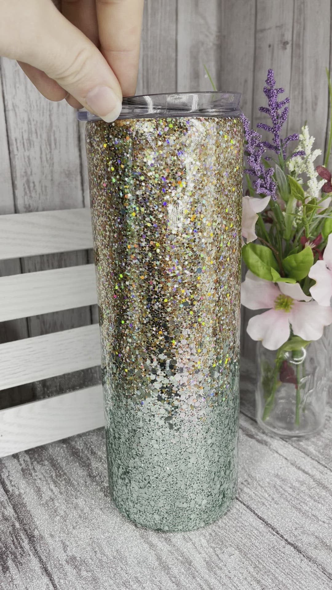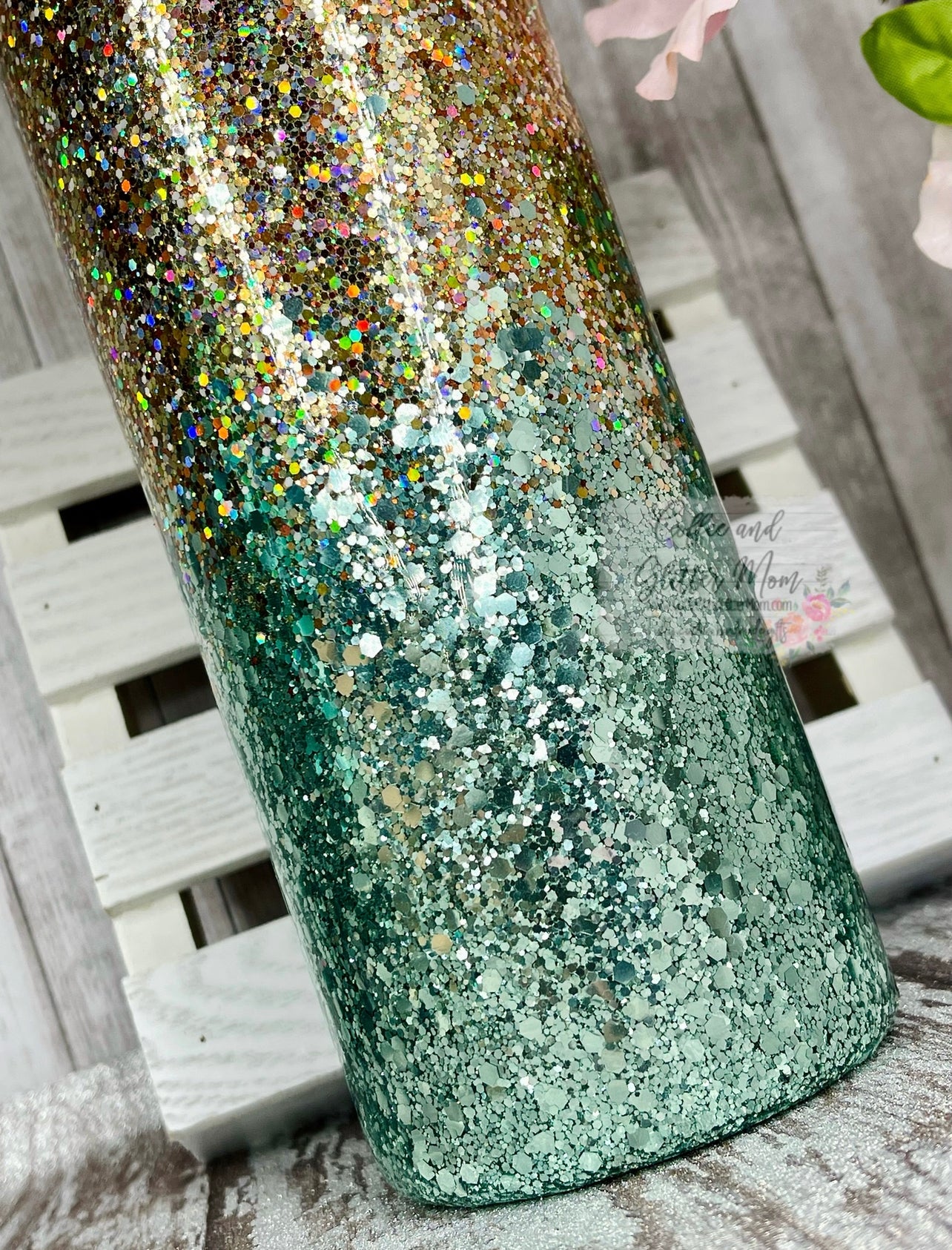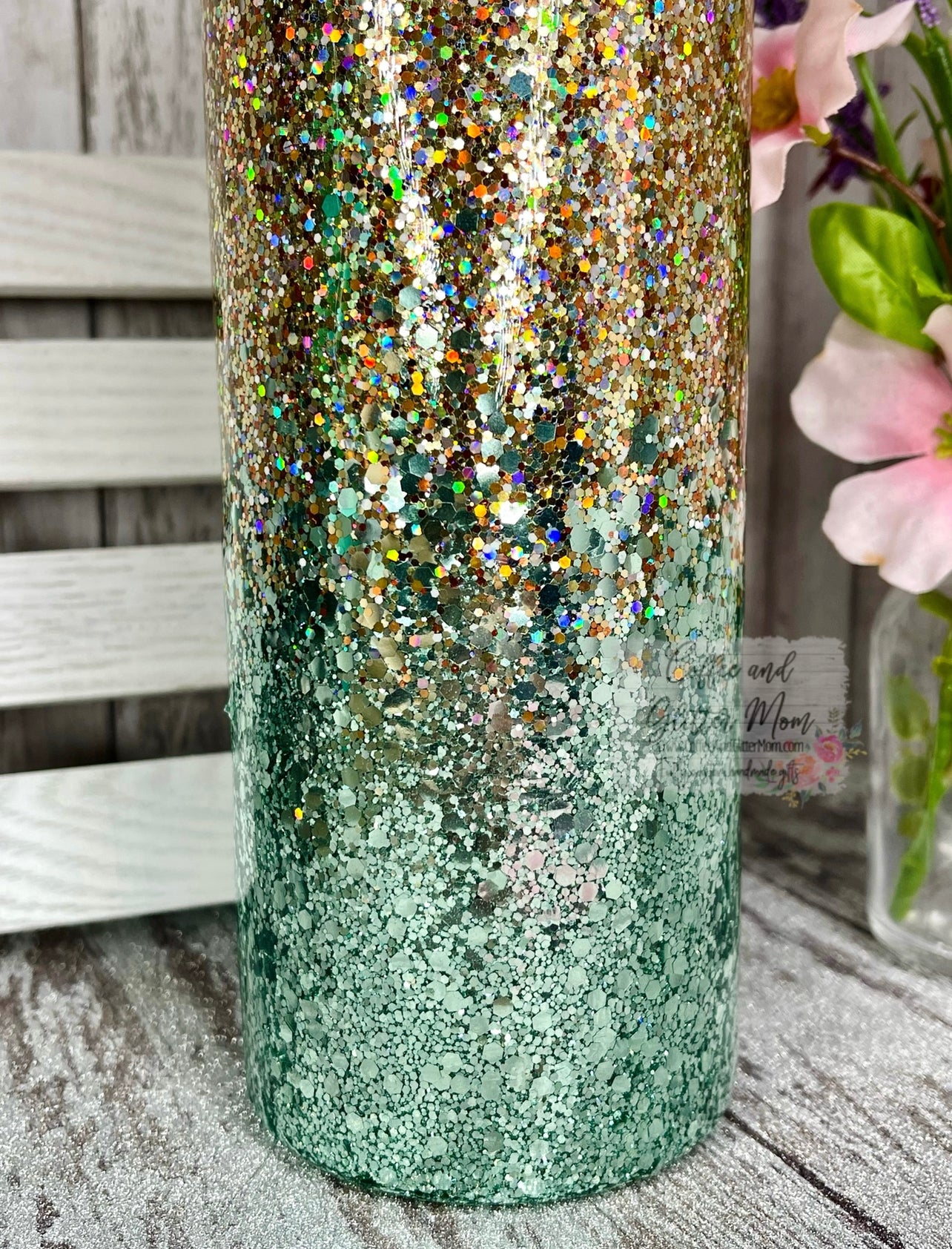 This tumbler has the color Sage all over it, which is a soft green with a matte to mirrored chunky glitter that you have to see to believe!