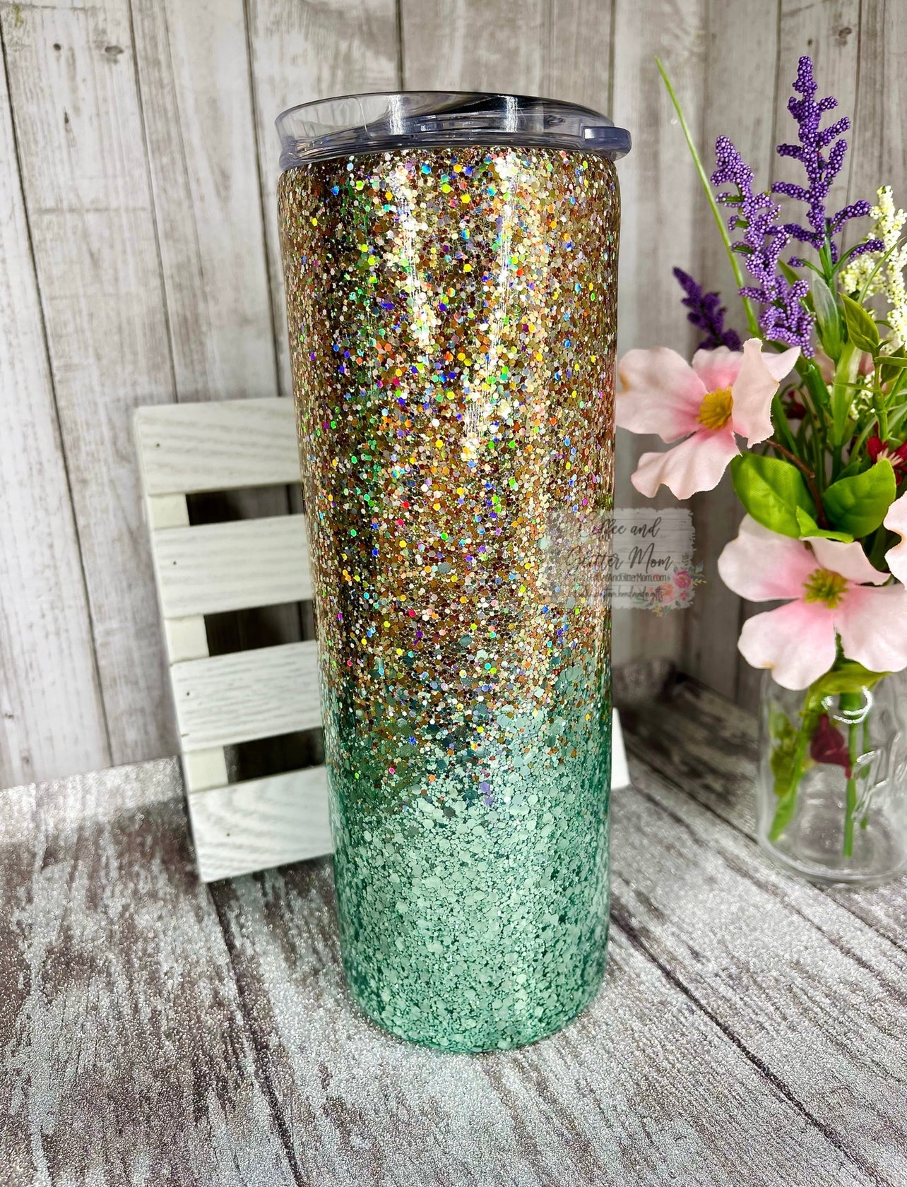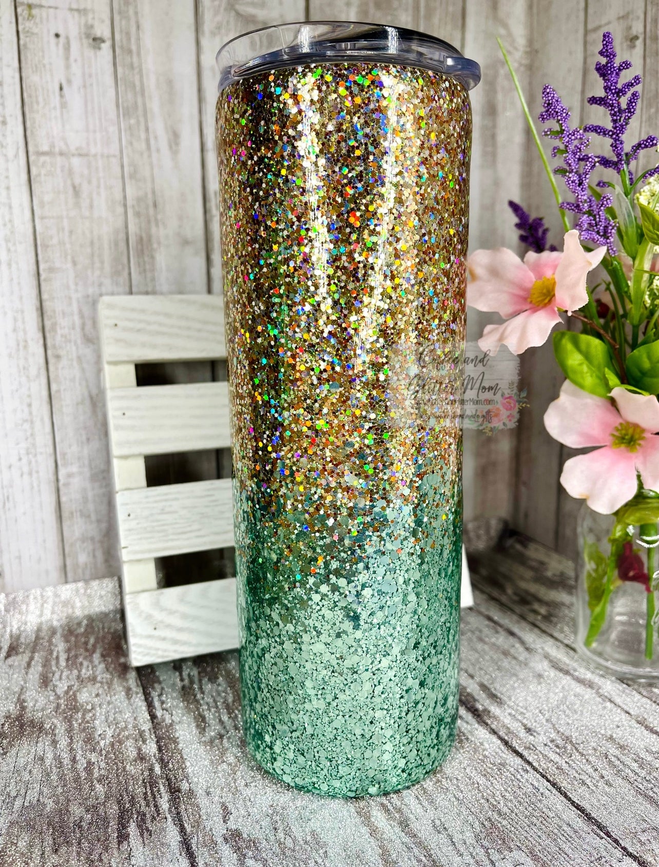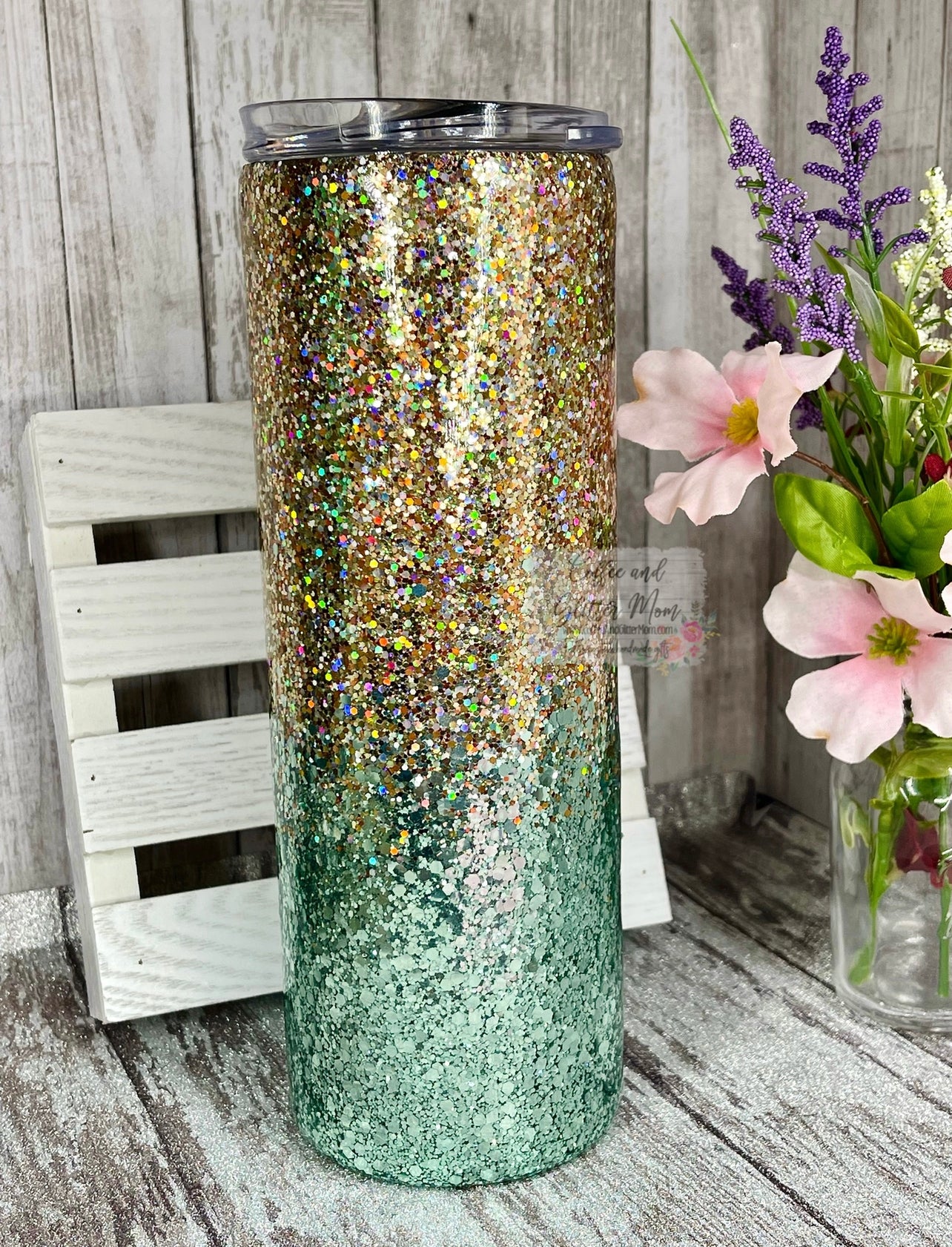 This tumbler has the color Sage all over it, which is a soft green with a matte to mirrored chunky glitter that you have to see to believe!