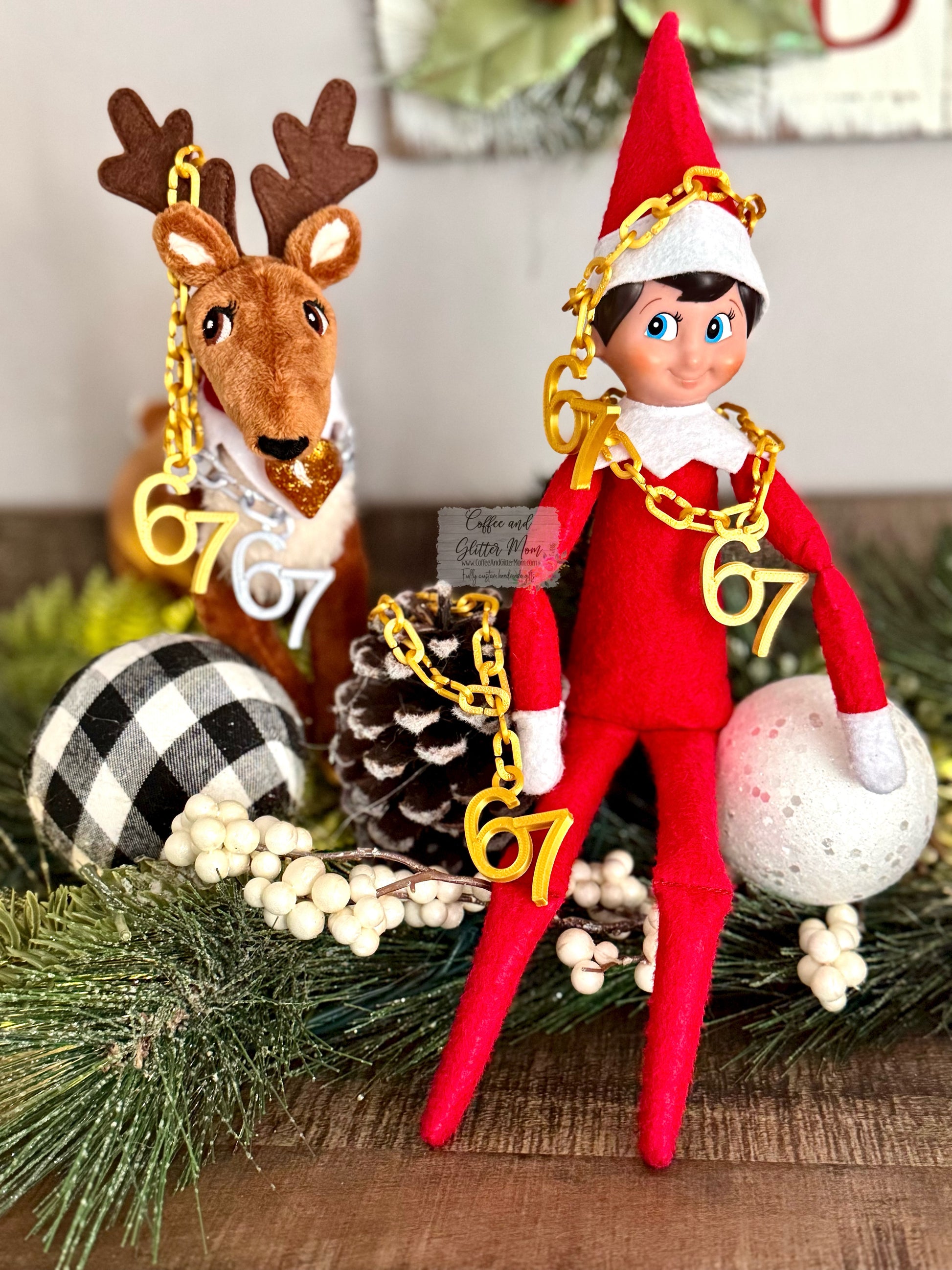 The “Six Seven” 6-7 pendant is a nod to elf-level urban swag — because even elves deserve a little drip. Lightweight, durable, and made to fit most elf dolls, this chain is the perfect mix of humor, holiday spirit, and street style. This chain will make your elf the coolest character in any festive display.