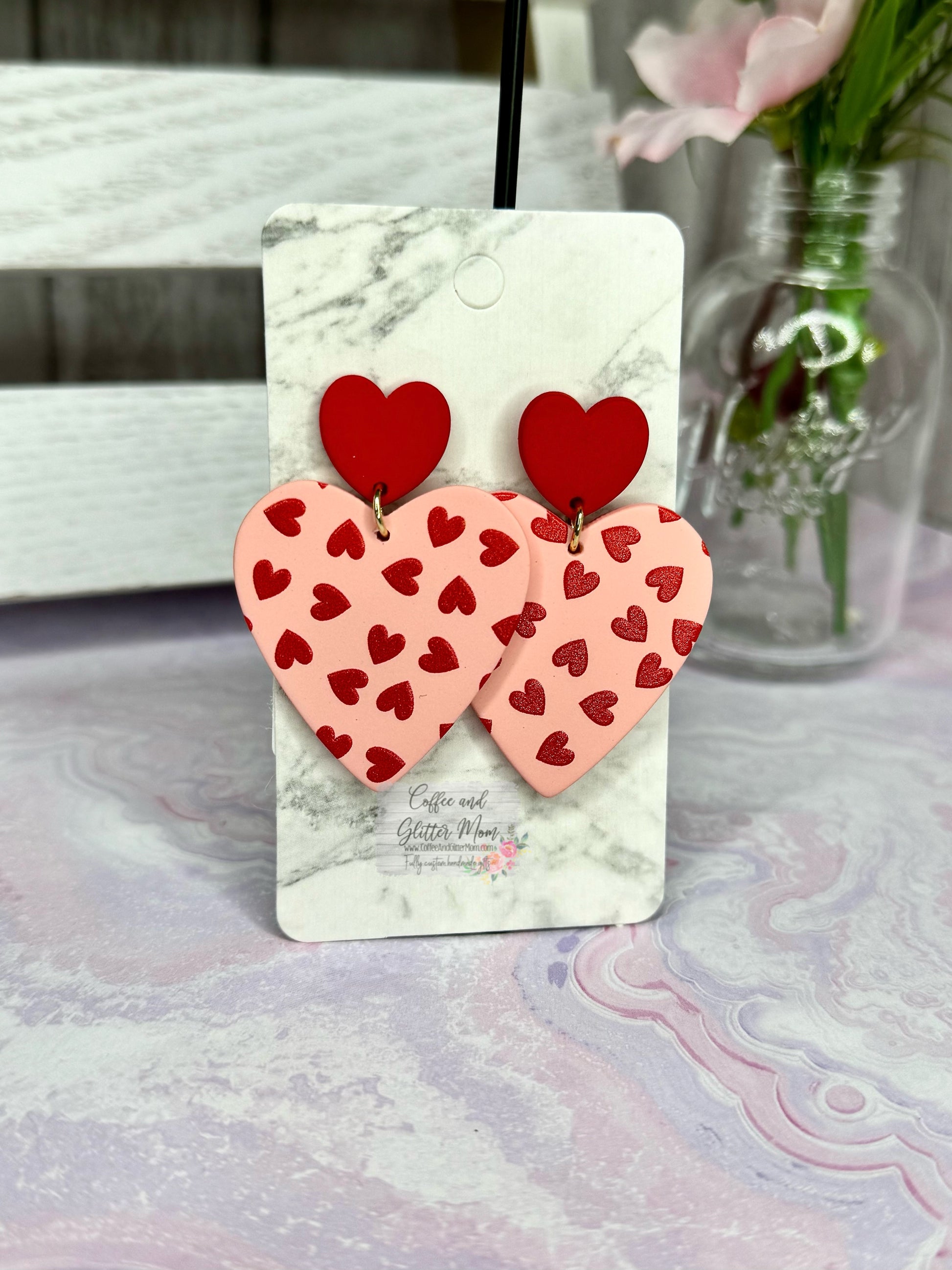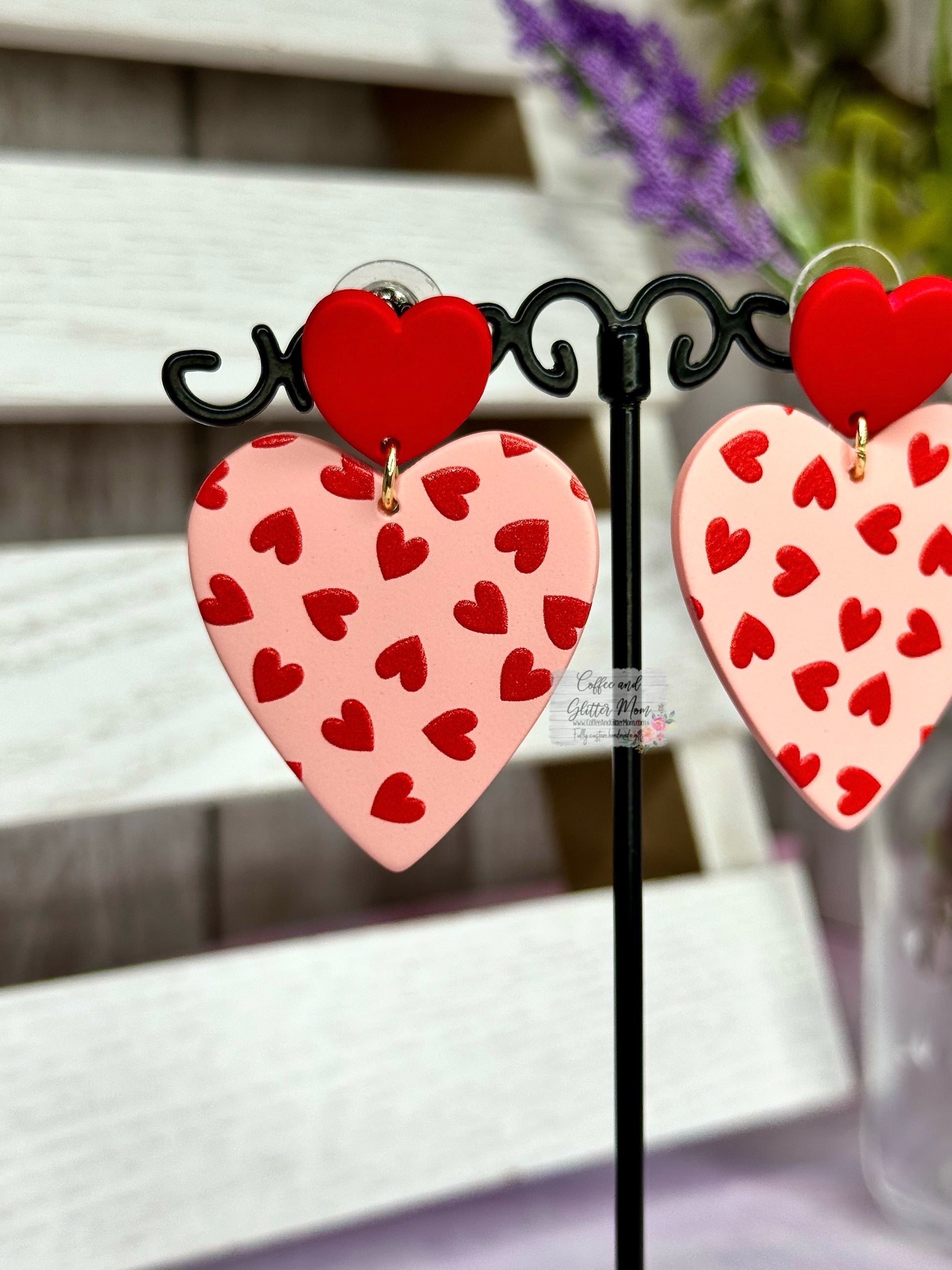 These lightweight clay earrings have textured little hearts on the front to really pop when they catch the light! They dangle approx. 5.5 inches in total length and are about 1.25 inches in width ands are a very lightweight clay. Only two pairs available!
