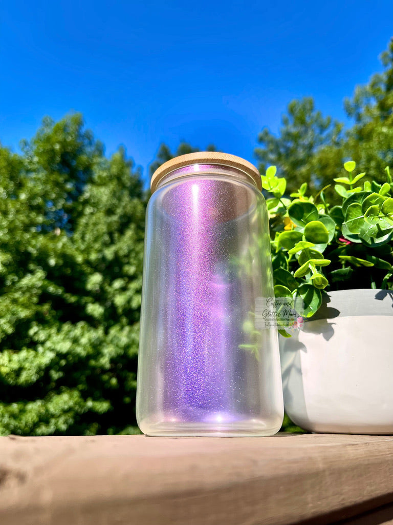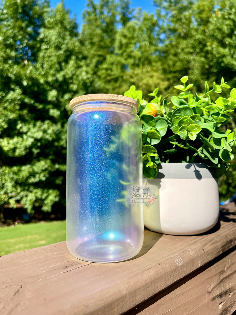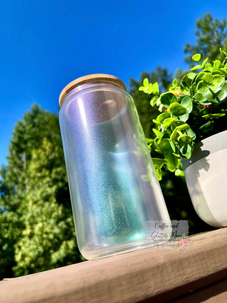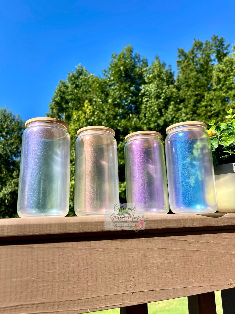 The iridescent glass cans are in limited quantities and are absolutely stunning! The pink has golden undertones, the green has purple color-shifting undertones as does the blue, and the purple has some pink shifts to it.