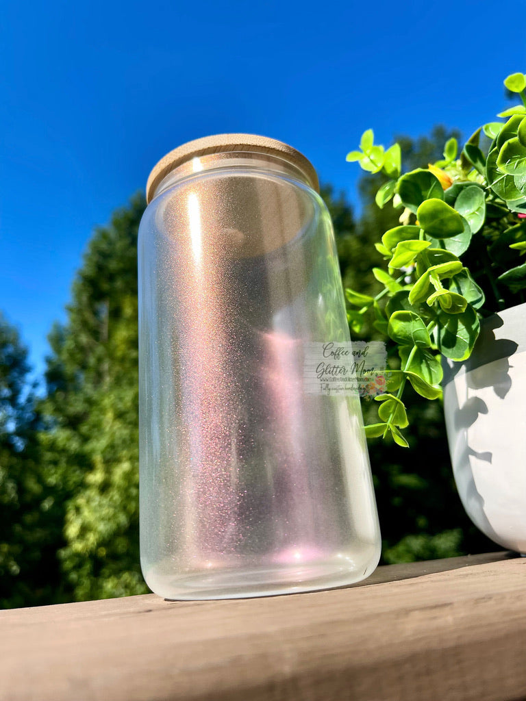 These glass cans come with bamboo lids and straws included. They stand about 6 inches tall and is about 10 inches around for the 16oz size. This glass can with lid makes the perfect gift for you and your loved one. As this is a glass can, you can see the image from the inside as well as the outside!