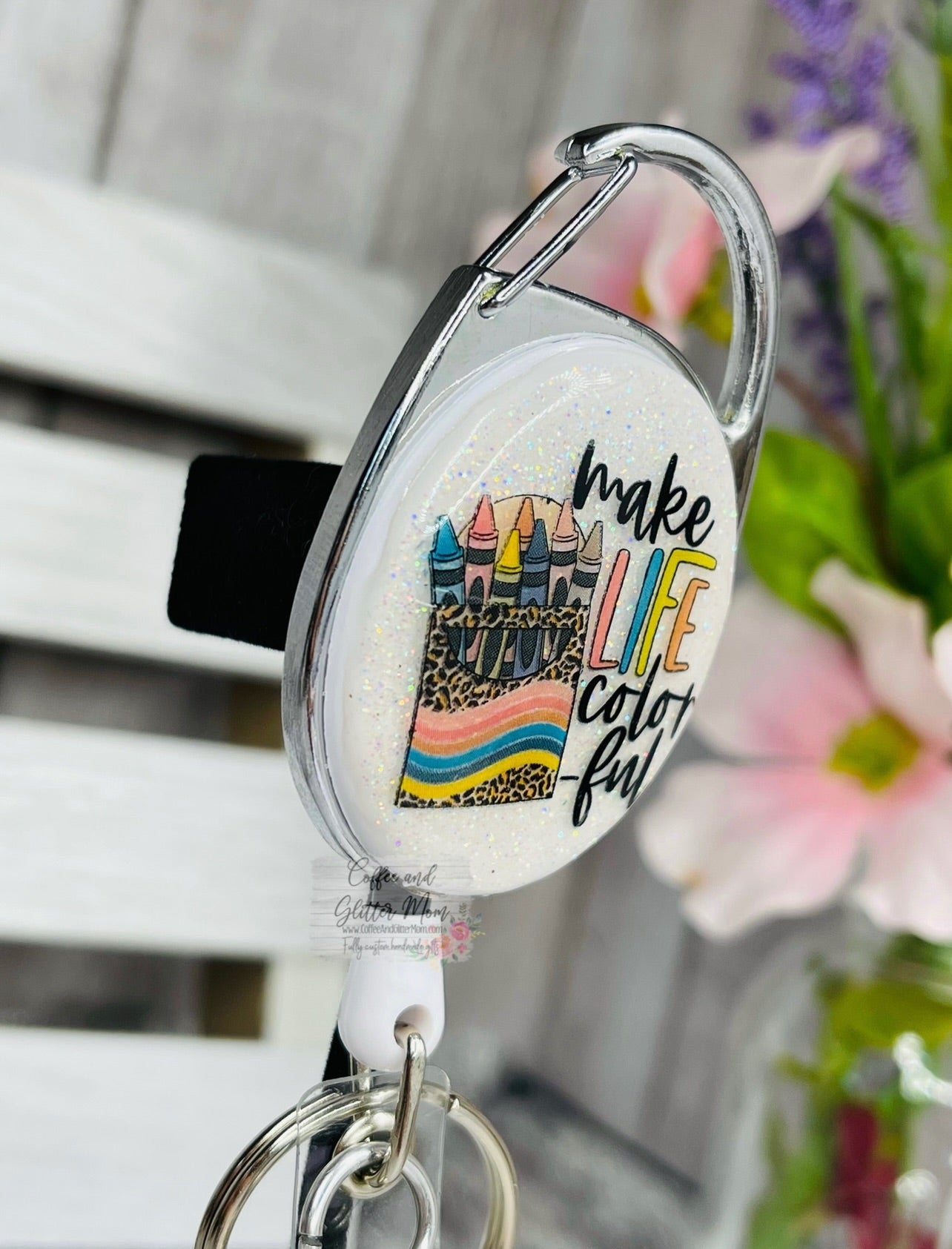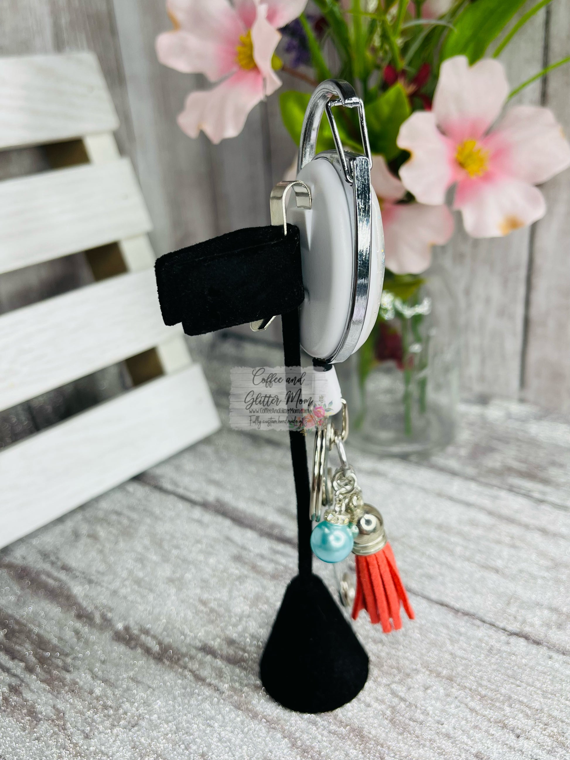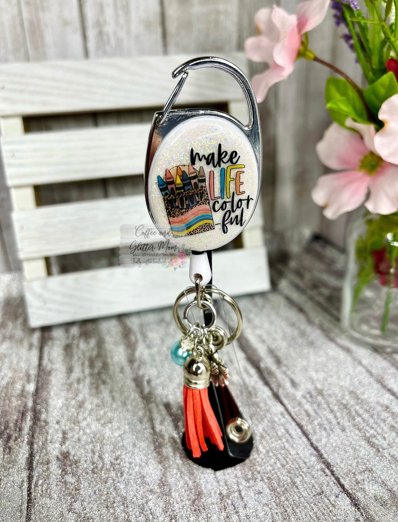 This would be a great one for an art teacher! Perfect to clip onto a belt loop, book bag, lanyard and more! Glittered in the color Iceland (a white with rainbow color shifting undertones), this reel really pops! Can be purchased with or without the hanging accessories (the pearl, charm, and tassel).