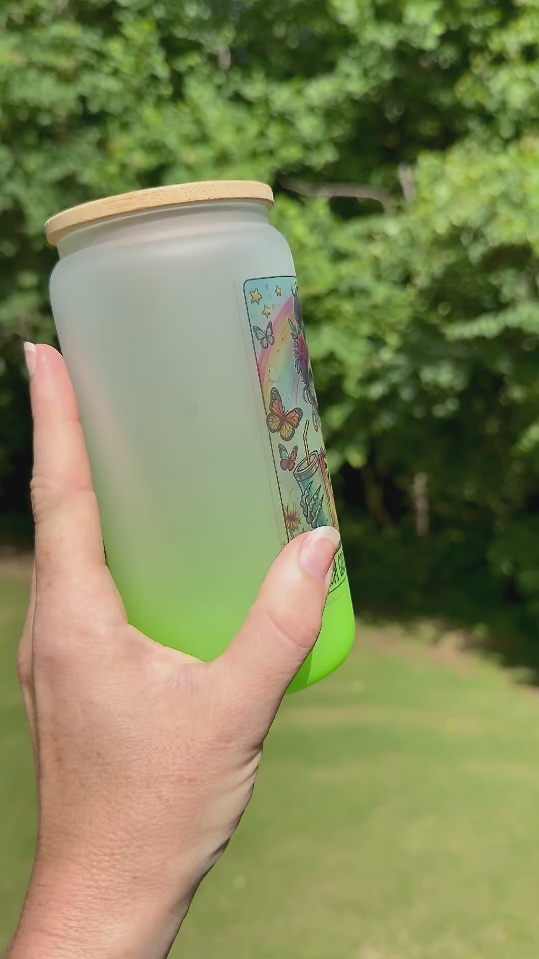 These glass cans come with bamboo lids and straws included. They stand about 6 inches tall and is about 10 inches around for the 16oz size. This glass can with lid makes the perfect gift for you and your loved one. As this is a glass can, you can see the image from the inside as well as the outside!