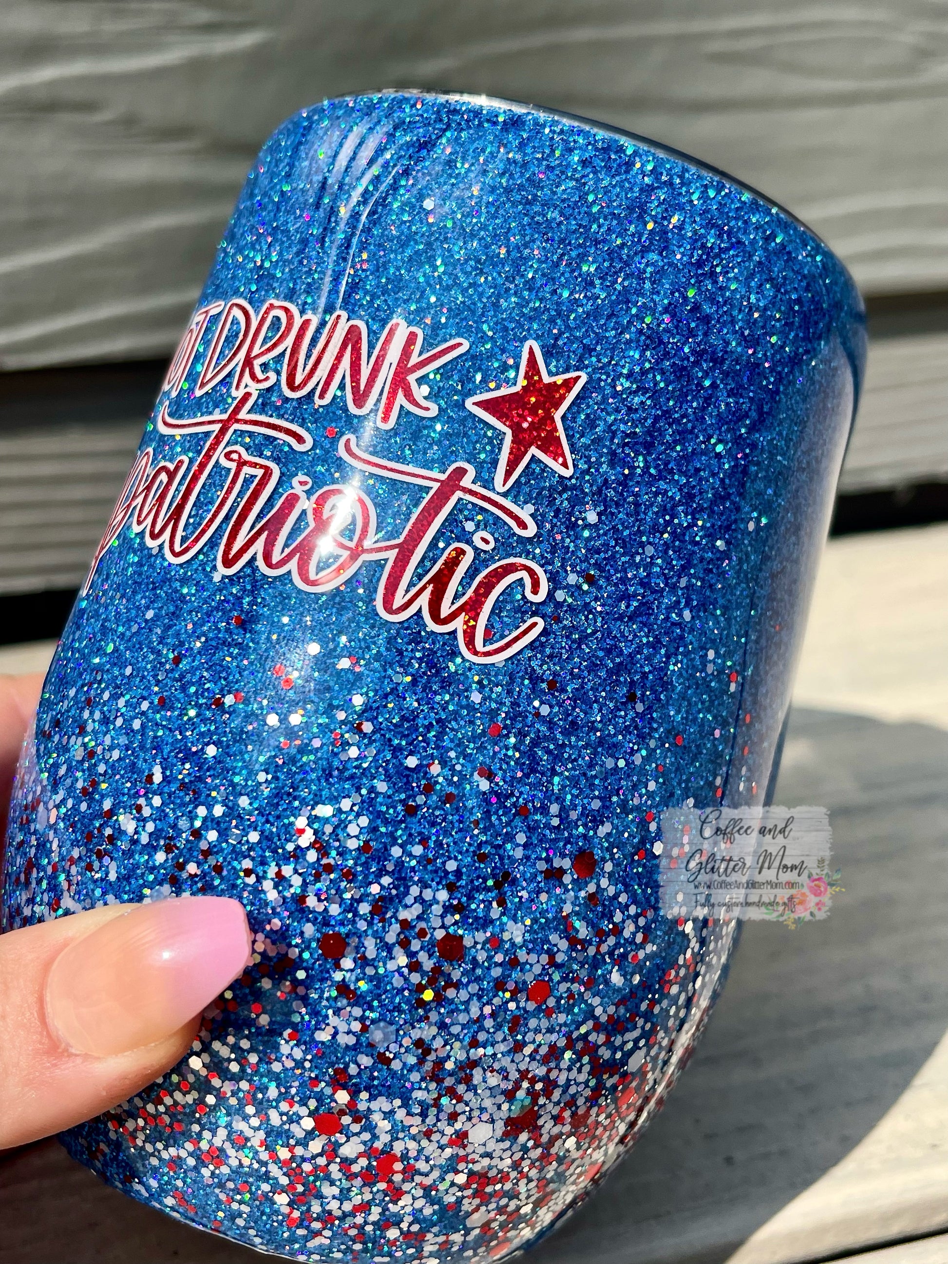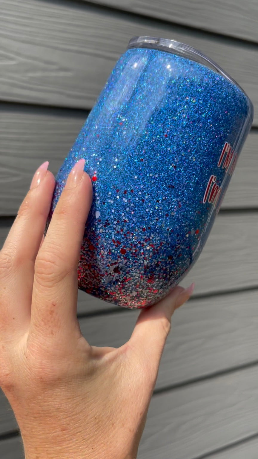 Perfect for the summer parties!! This 15oz wine tumbler that comes with a slide-close lid and a straw. The chunky mix of reds and whites with little silver flakes really pops with the holographic blue glitter as a base! The decal (which is also a holographic red!) is sealed under an FDA approved epoxy. Only one available, ready to go!