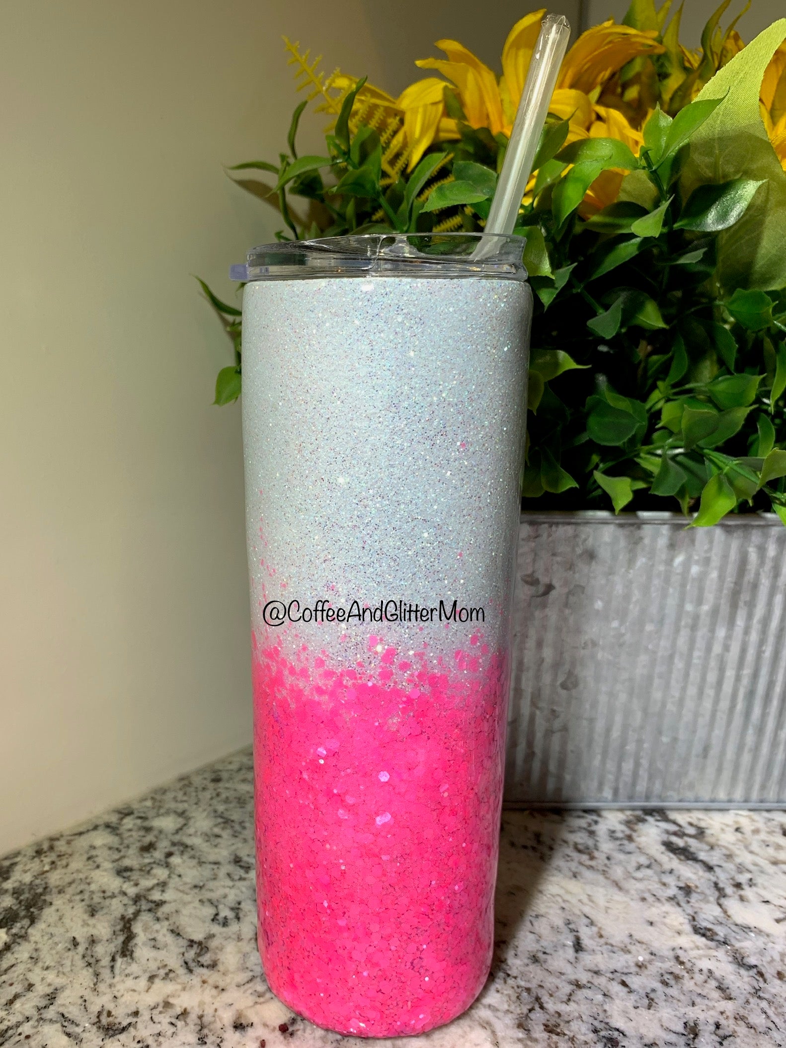 Opal ice is a white glitter with pink undertones. Shown on the 20oz skinny tumbler with Sweet Pea Pearl chunky on the bottom. You can also see the difference from the 3 white tones.