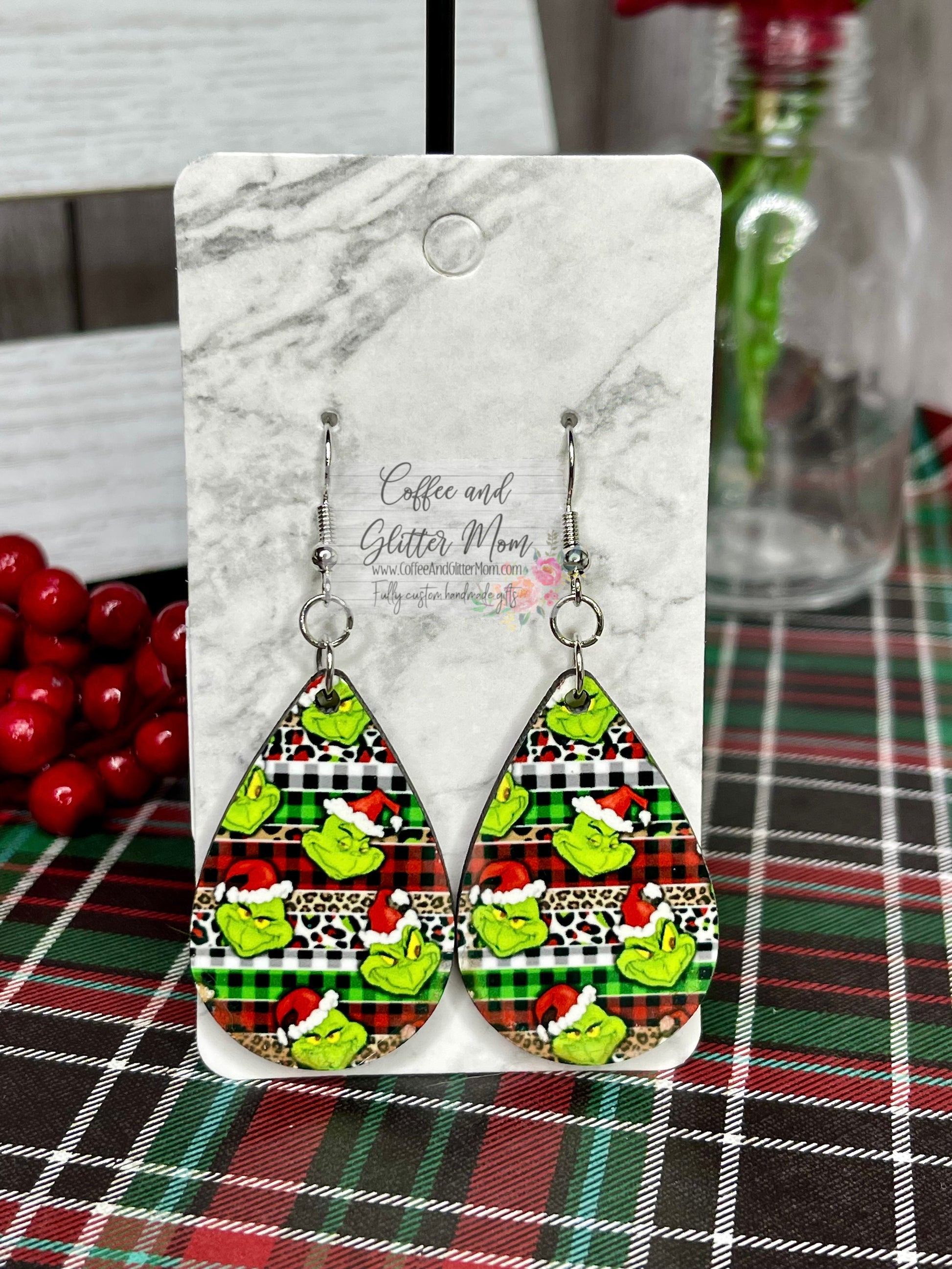 Plaid Stripe Grinch Christmas Earrings