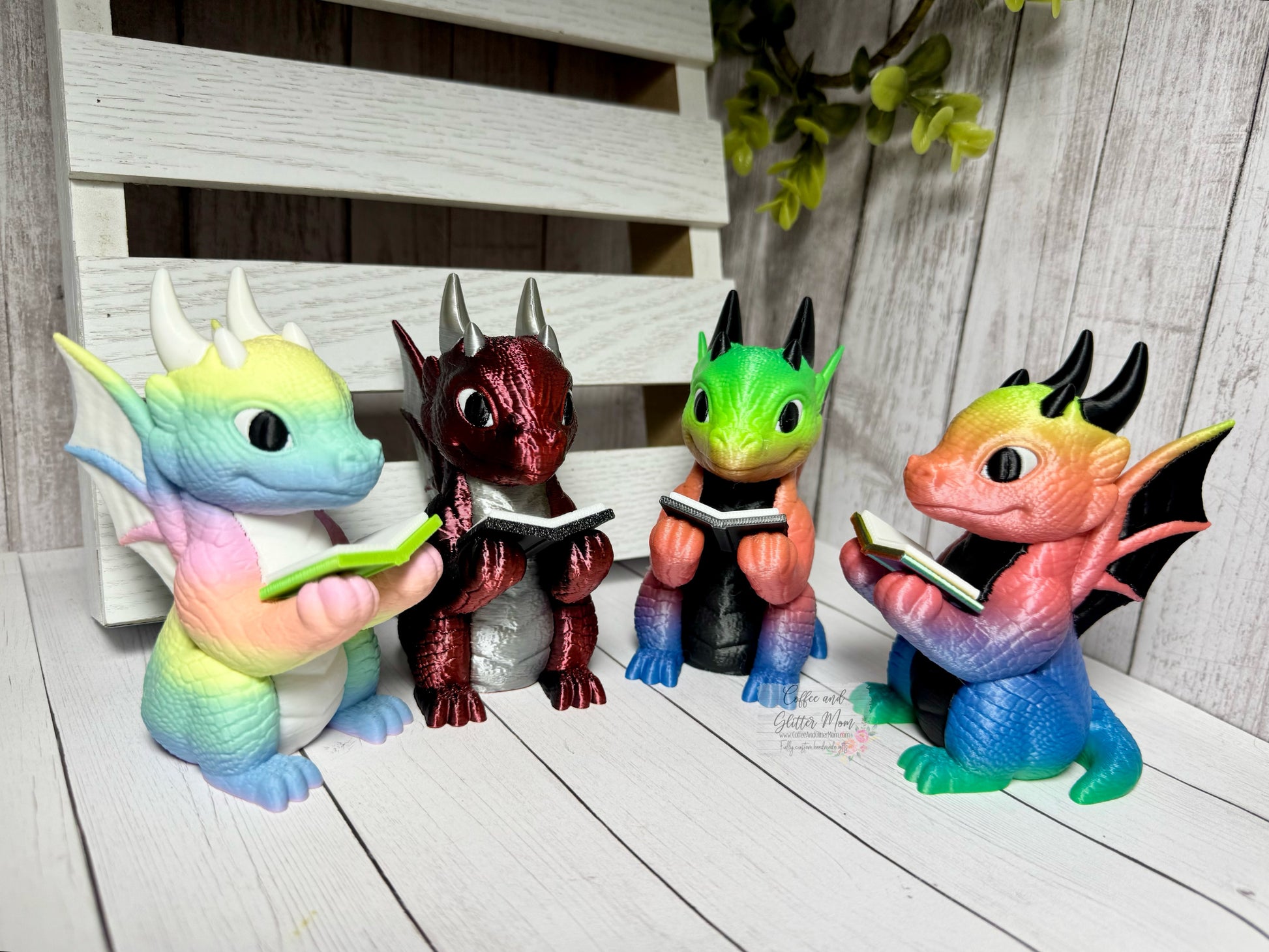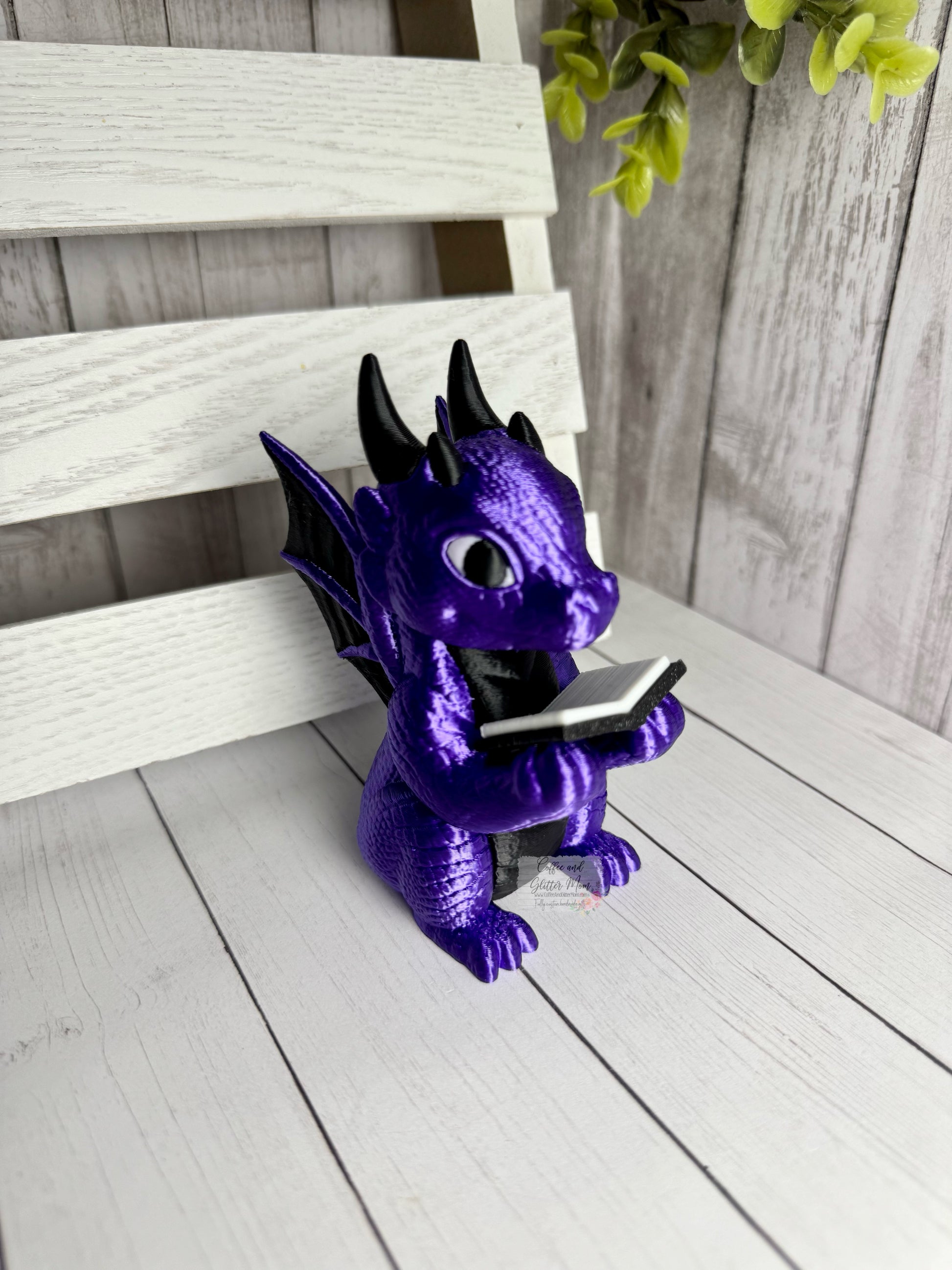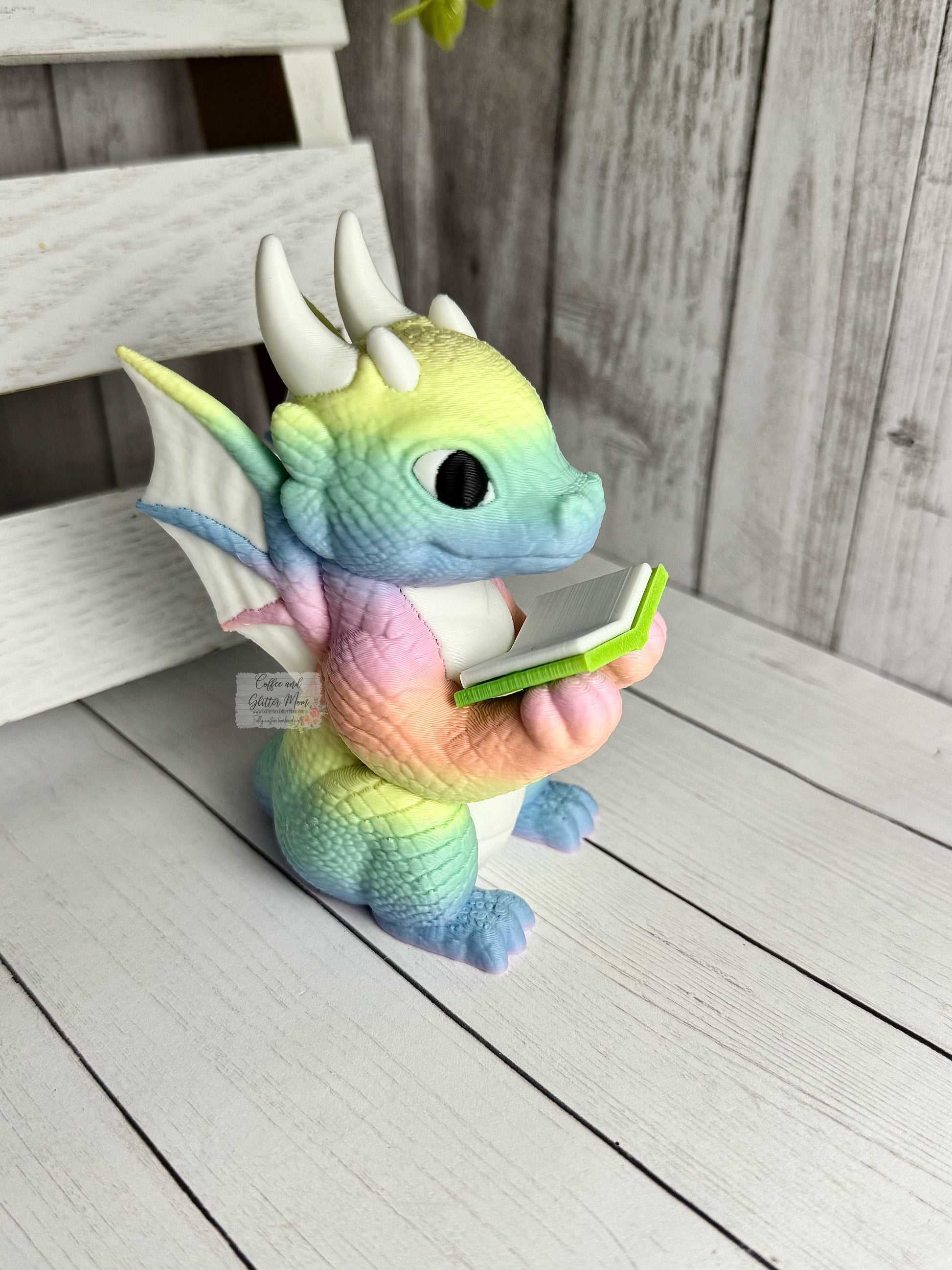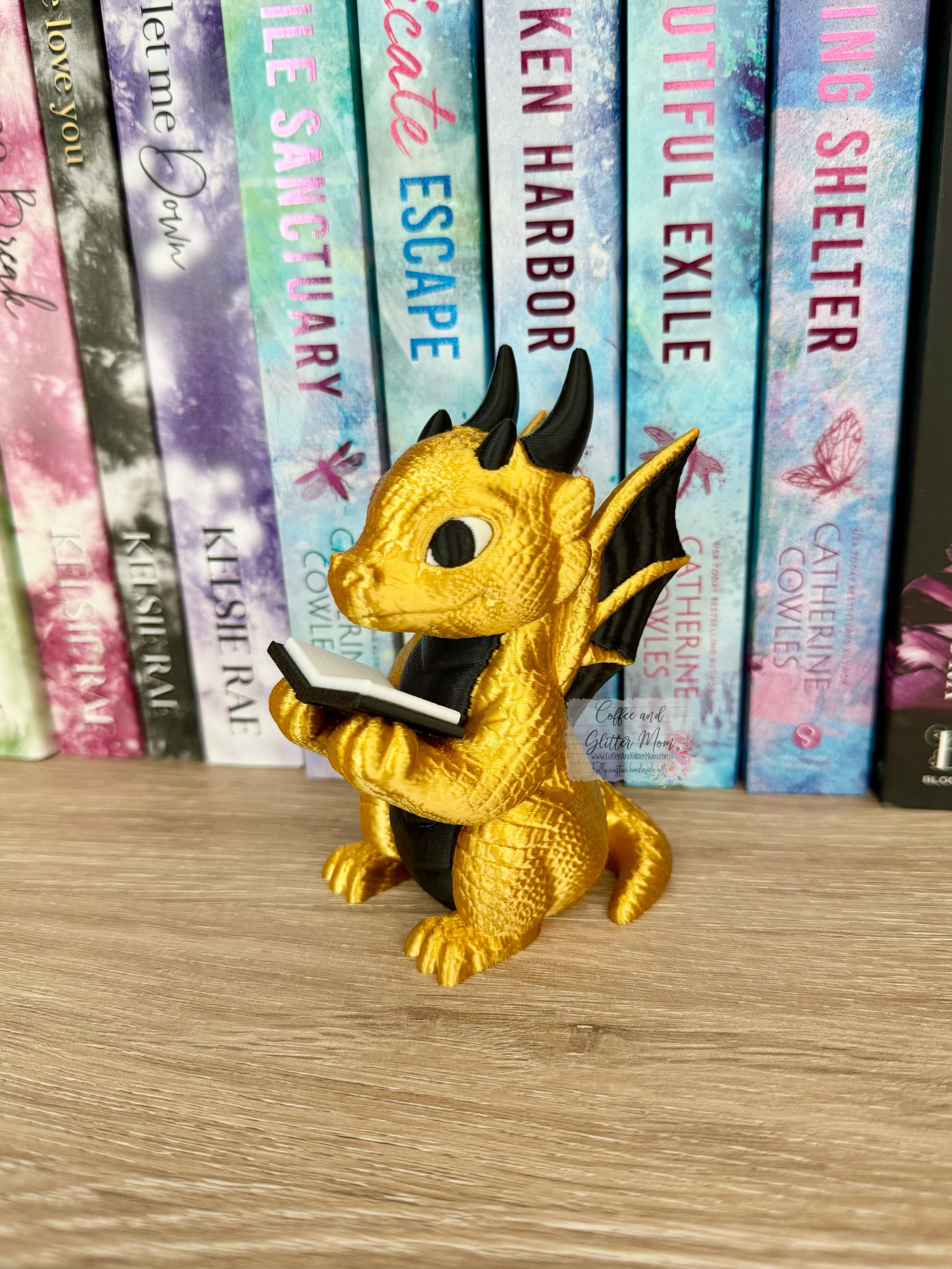 The perfect book shelf decor for any fantasy lover, now available for your desk or shelf. This book shelf figure is meticulously modeled to include as much detail as possible. Designed to look like a cute dragon in a chibi style reading a book. Crafted with precision using high-quality, eco-friendly PLA material, this dragon-shaped decor adds a playful, spooky vibe to any room. They even have a little sparkle in their eyes if you look closely! He comes with a small black book glued to his hands to complete the look!