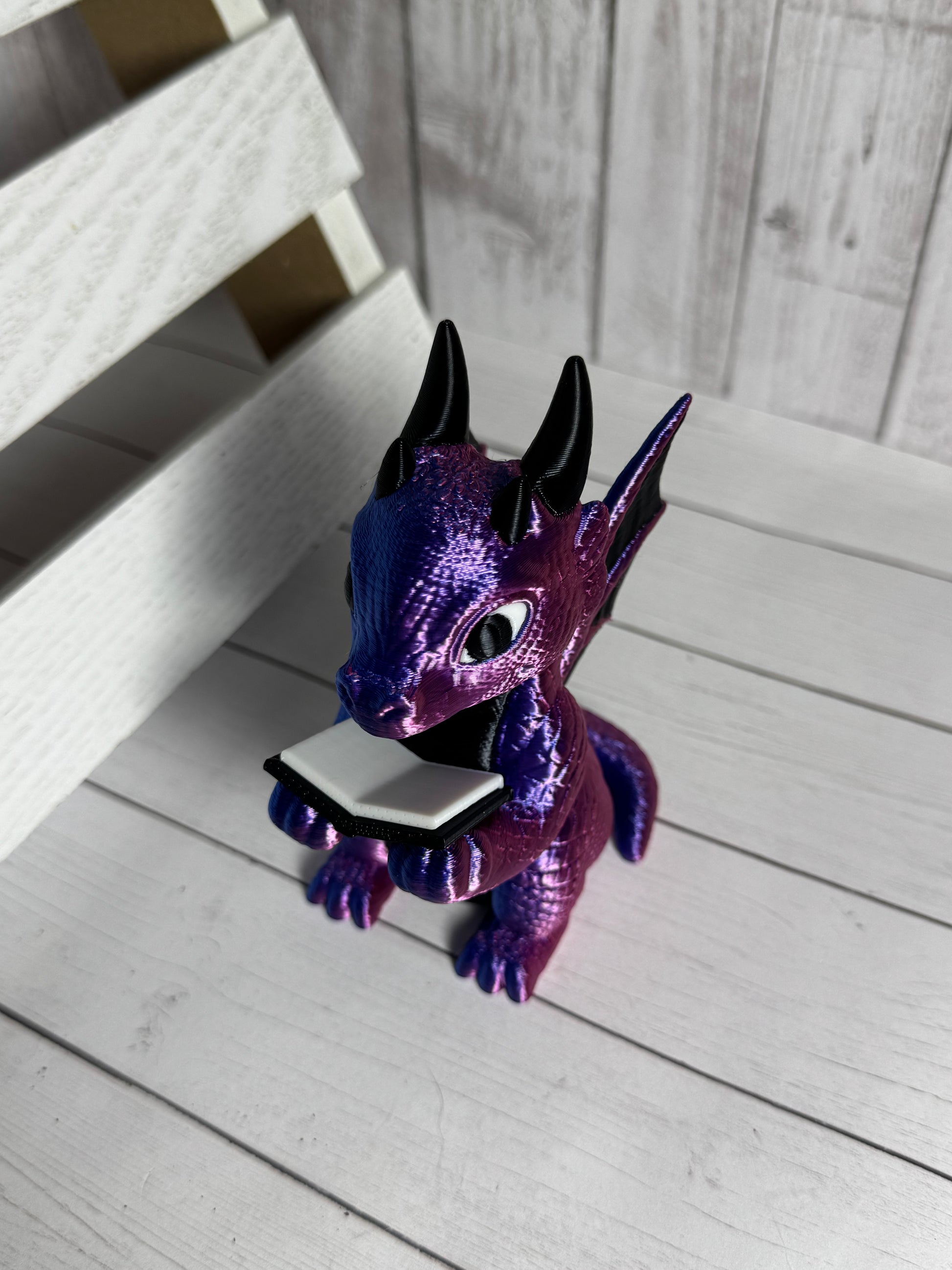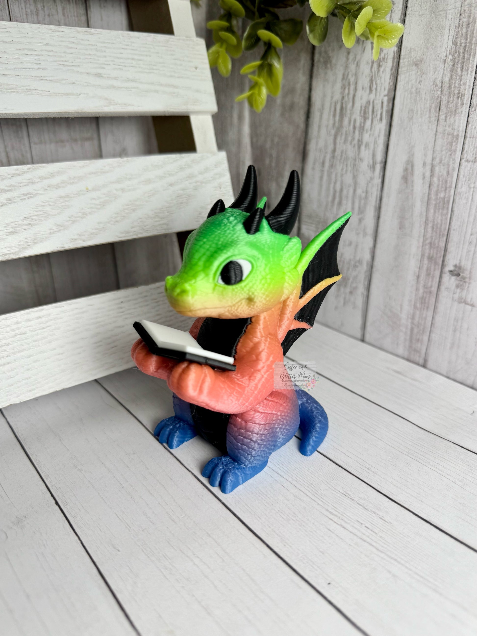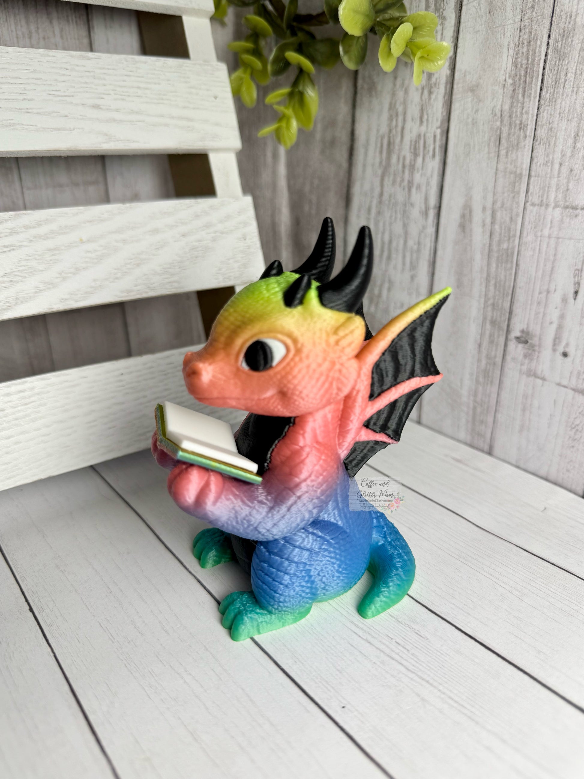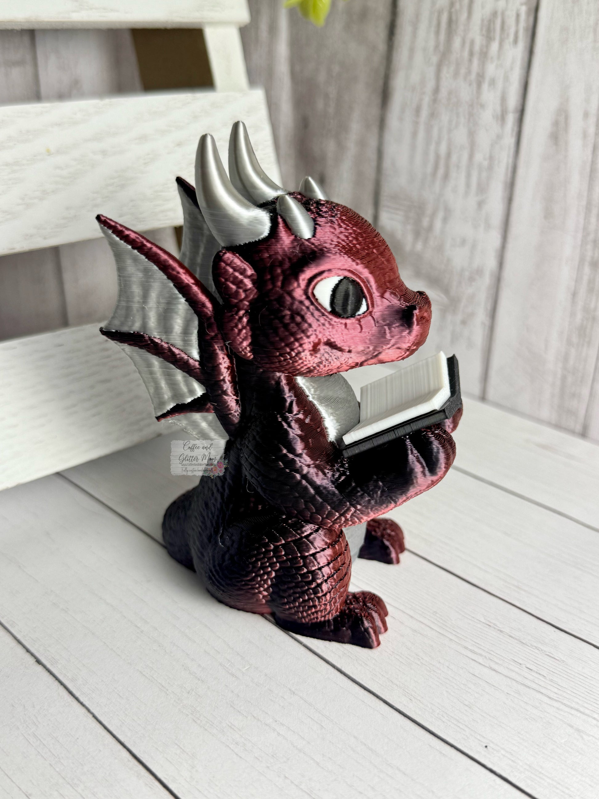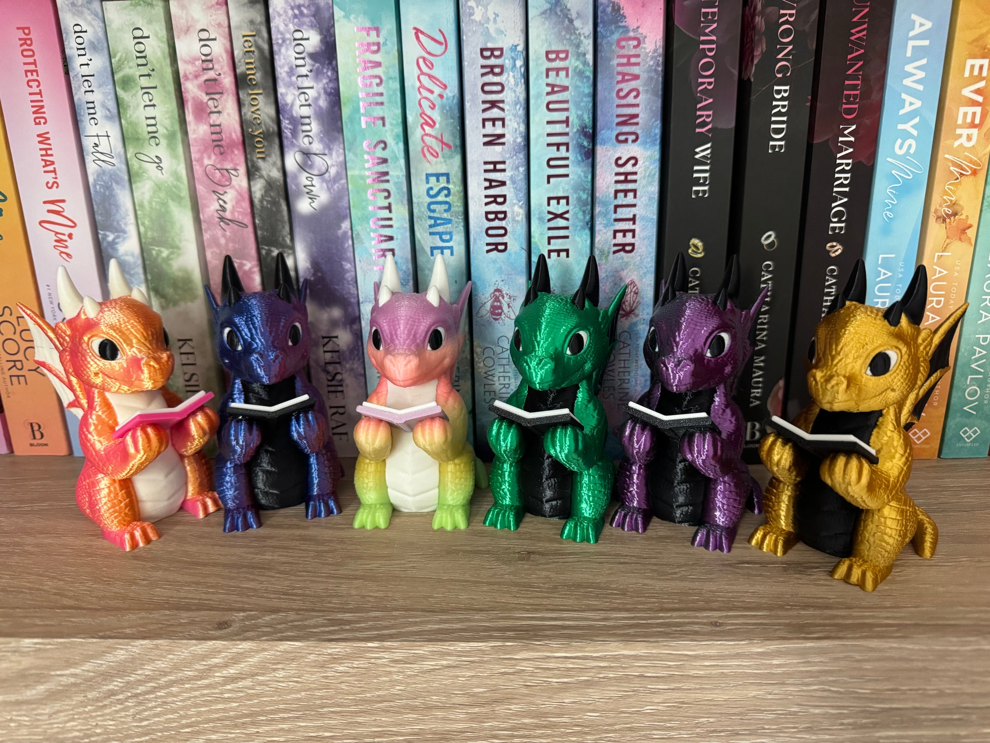 The perfect book shelf decor for any fantasy lover, now available for your desk or shelf. This book shelf figure is meticulously modeled to include as much detail as possible. Designed to look like a cute dragon in a chibi style reading a book. Crafted with precision using high-quality, eco-friendly PLA material, this dragon-shaped decor adds a playful, spooky vibe to any room. They even have a little sparkle in their eyes if you look closely! He comes with a small black book glued to his hands to complete the look!