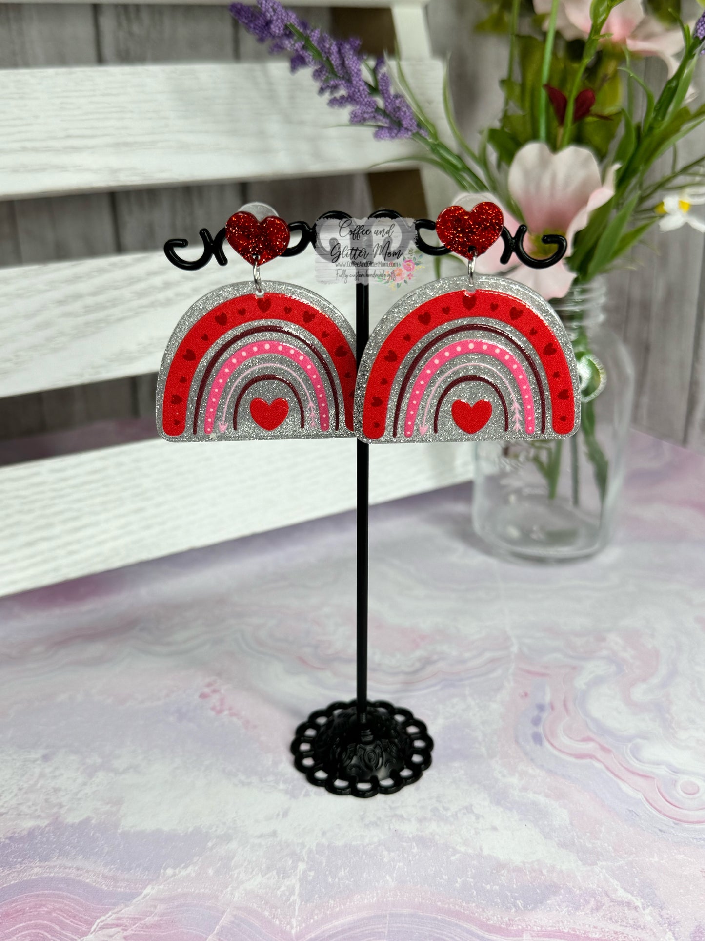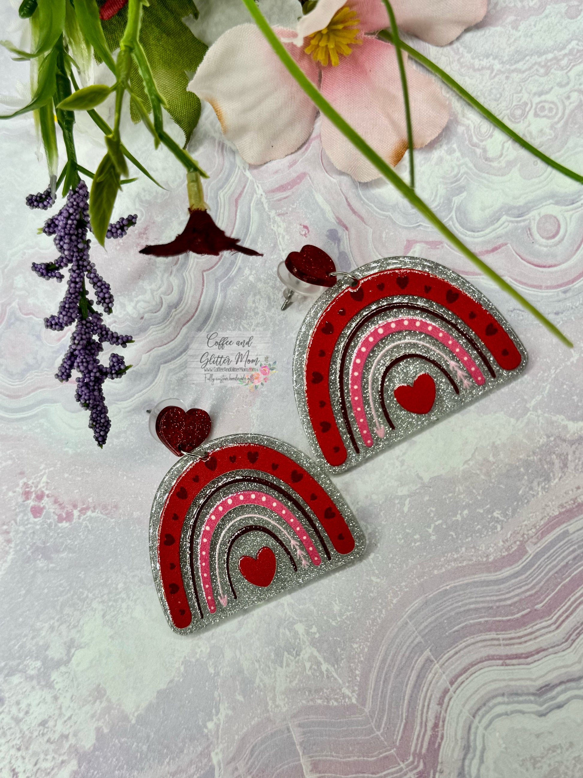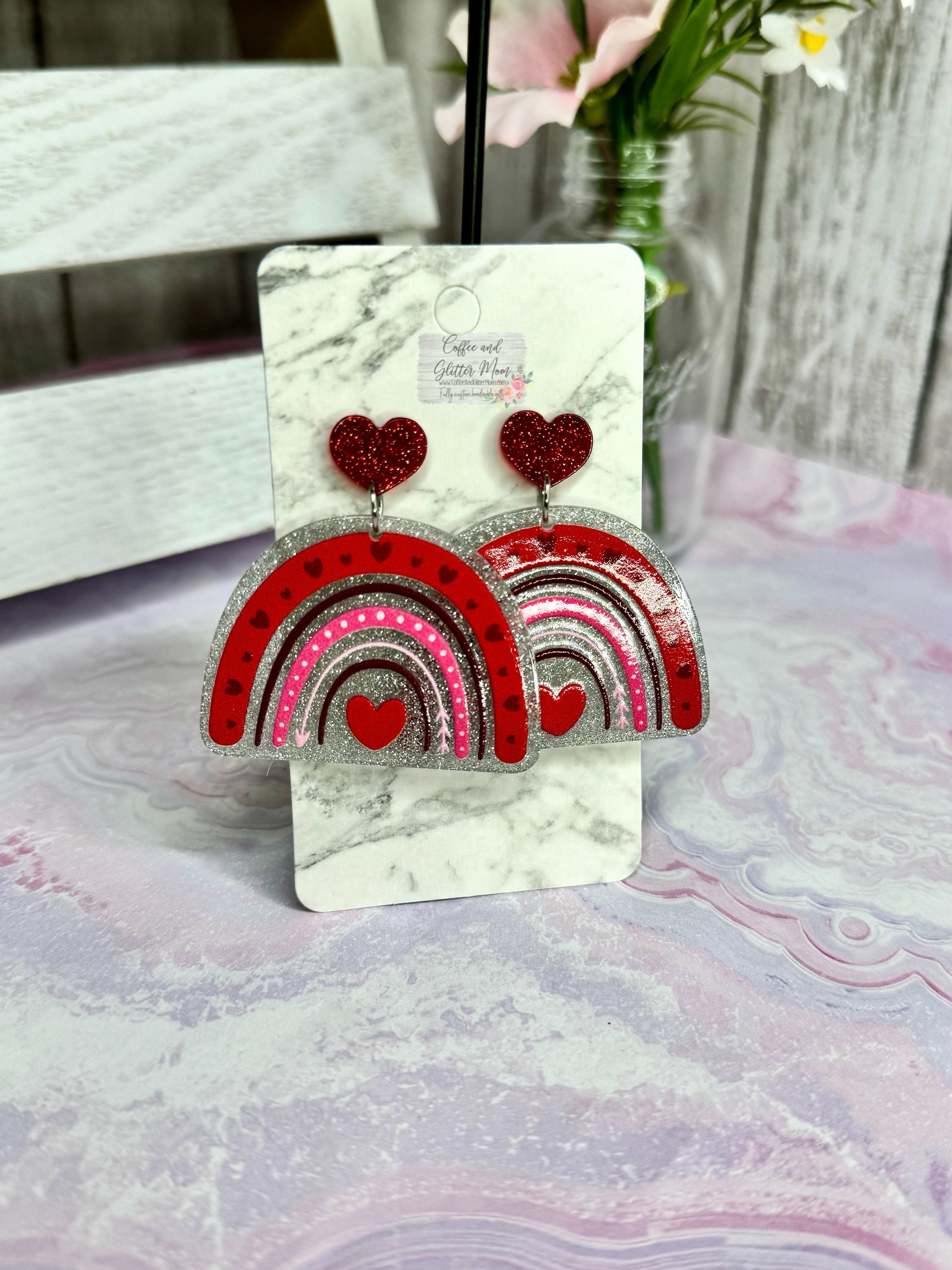 These lightweight acrylic cuties really pop with the red glitter hearts at the studs! The rainbow designs are raised as well for a textured look. They dangle approx. 2.5 inches in total length and are about 1.25 inches in width ands are a very lightweight acrylic. Only one pair available!