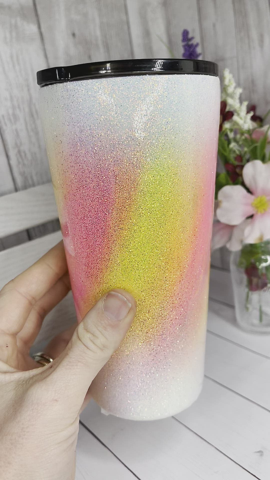 This tumbler is white on the top and bottom with a stunning burst of color in the middle! The color is actually hand-painted on the tumbler so no two will ever be alike. The pink, yellow and orange scream summer and it’s perfect with or without a decal! (16oz size pictured)