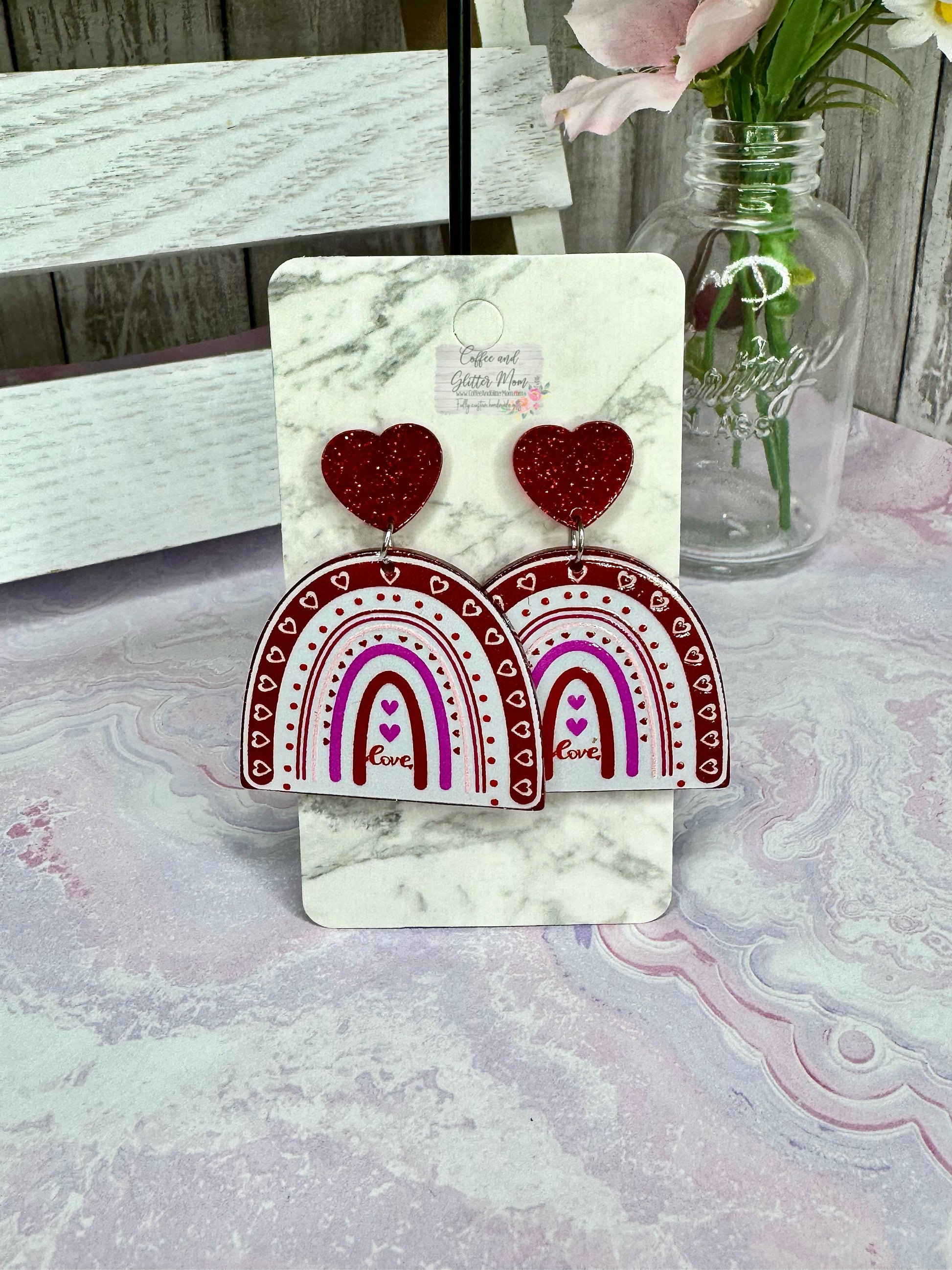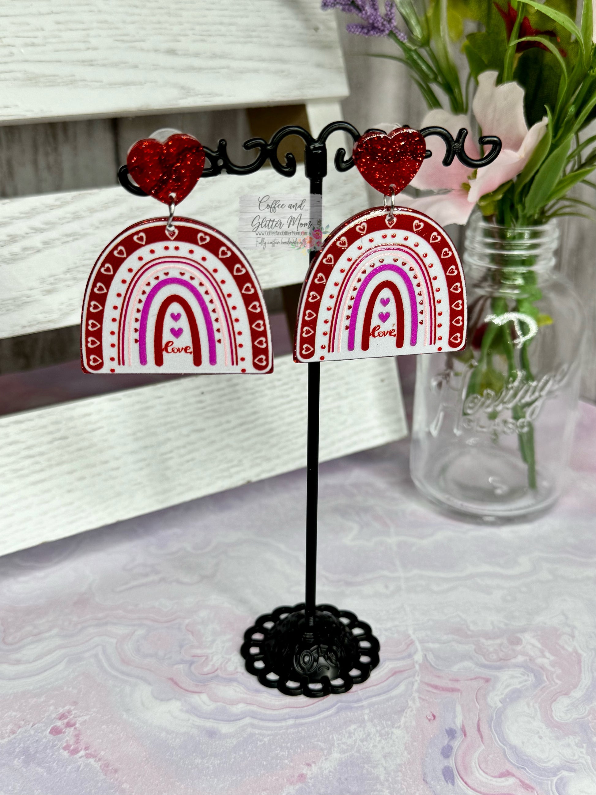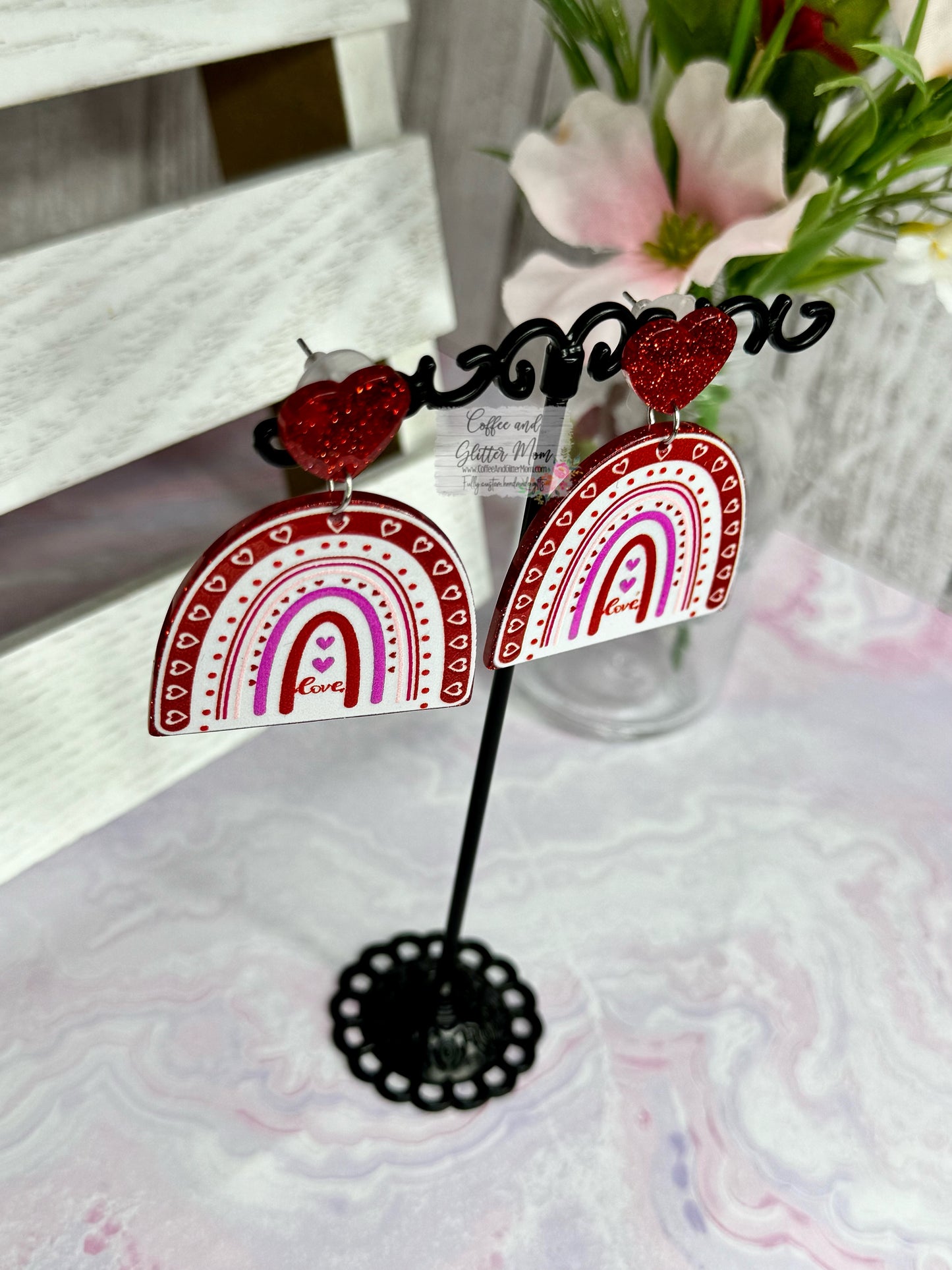 These lightweight acrylic cuties really pop with the red glitter hearts at the studs! The rainbow designs are raised as well for a textured look. They dangle approx. 2.5 inches in total length and are about 1.25 inches in width ands are a very lightweight acrylic. Only one pair available!